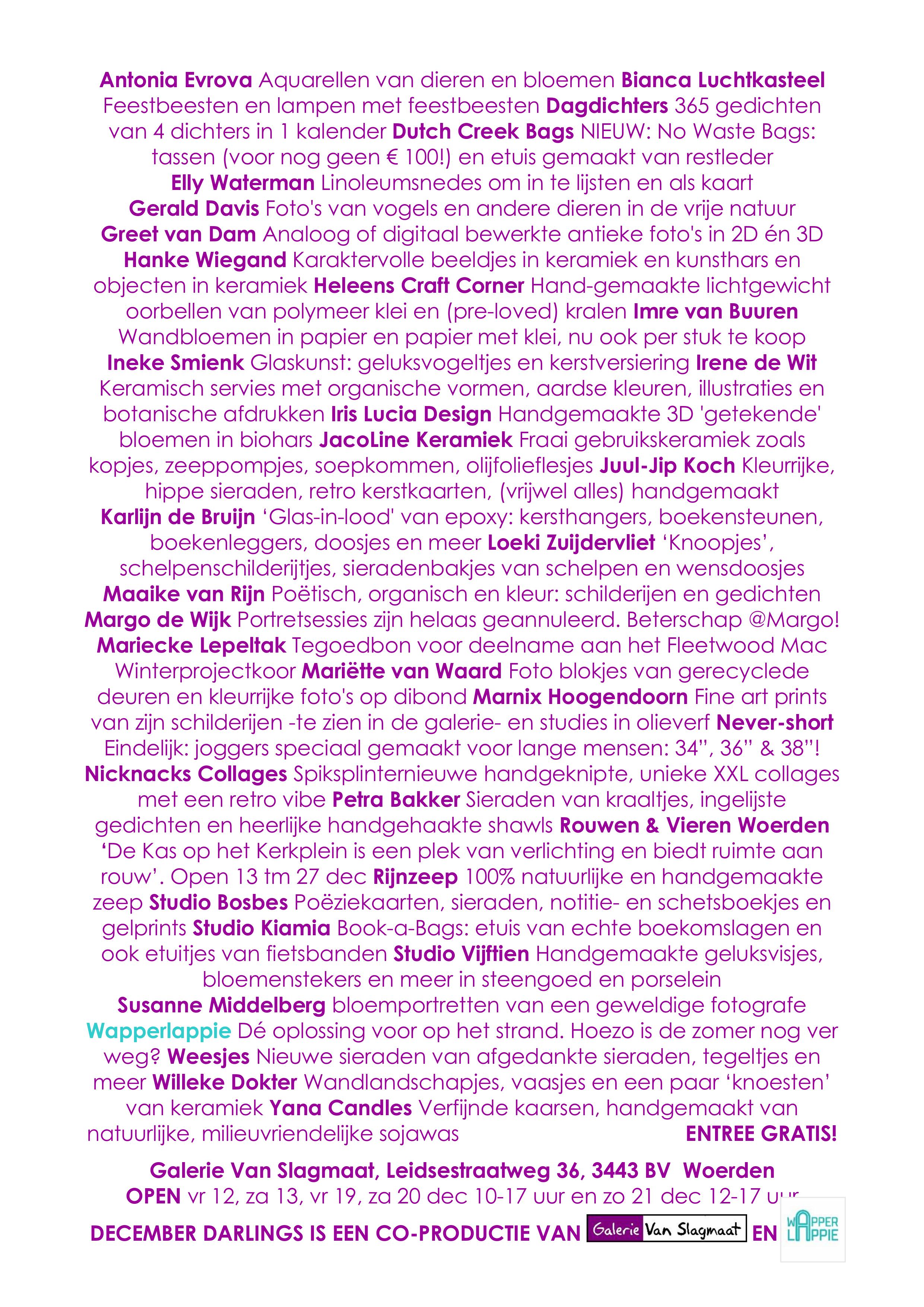 Voor een exclusief handgemaakt product of kunstwerk tussen € 2 en € 100, moet je op 12, 13, 19, 20 of 21 december in de galerie zijn! Voor de elfde keer organiseer ik met Silvia Veldkamp (Wapperlappie) December Darlings, een expositie waaraan dit jaar 34 kunstenaars en makers meewerken. We toveren de galerie en expositieruimte om tot een 115 m2 groot kunstzinnig paradijs waar je naar hartenlust kunt shoppen. In de galerie is uiteraard ook de reguliere collectie te vinden en de prachtige expositie van Marnix Hoogendoorn te zien.