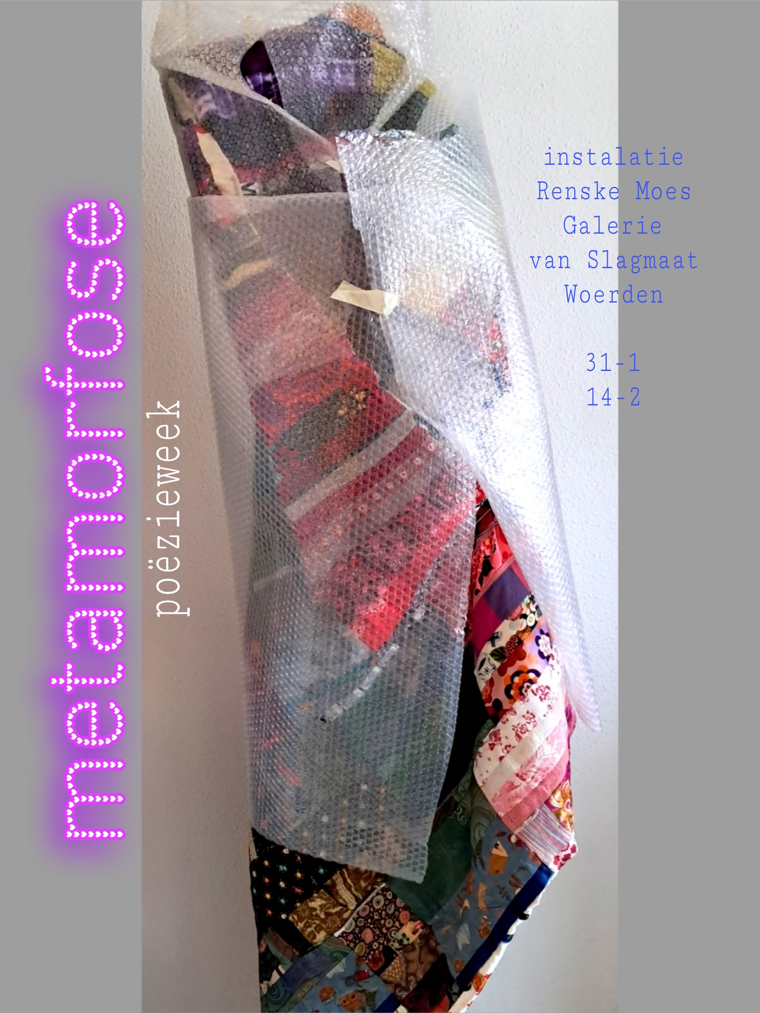 Het project bestaat uit verschillende componenten: Beeldend kunstenares Renskej Moes maakte speciaal voor de gedichtenpresentatie in de Expositieruimte ruimtelijke kunstwerken met het thema Metamorfose. Lees hier de door haar geschreven toelichting. Renskes installatie is te zien op 30 en 31 januari en op 6, 7, 13 en 14 februari 2026. Ze is elke zaterdag aanwezig.