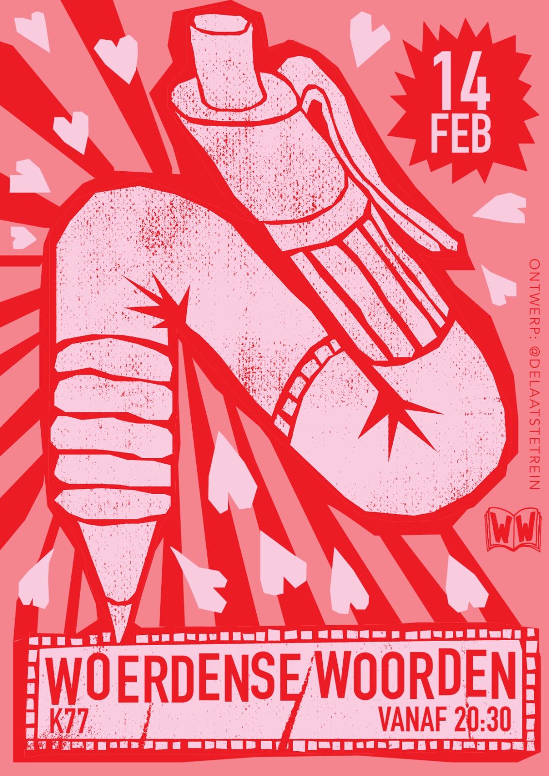 | Za 14 februari 2026 – K’77 vanaf 20.30 uur Hou je van gedichten? Draagt voor of kom luisteren op zaterdag 14 februari 2026 bij K’77 (Hoge Rijndijk 3A Woerden) naar een liefdevolle editie van Woerdense Woorden, want ja mensen: Valentijnsdag ♥ Inloop vanaf 20.30 uur, aanvang 21.00 uur. Omlijst met love songs door DJ Chris! Entree gratis. Woerdense Woorden is een lokaal dichtpodium, bedacht en georganiseerd door dichter Ronald E. Aalten (1990 Woerden). Het vindt maandelijks plaats op wisselende plekken in Woerden, soms met gastdichters van buiten de stad. Blijf op de hoogte via Facebook ! |