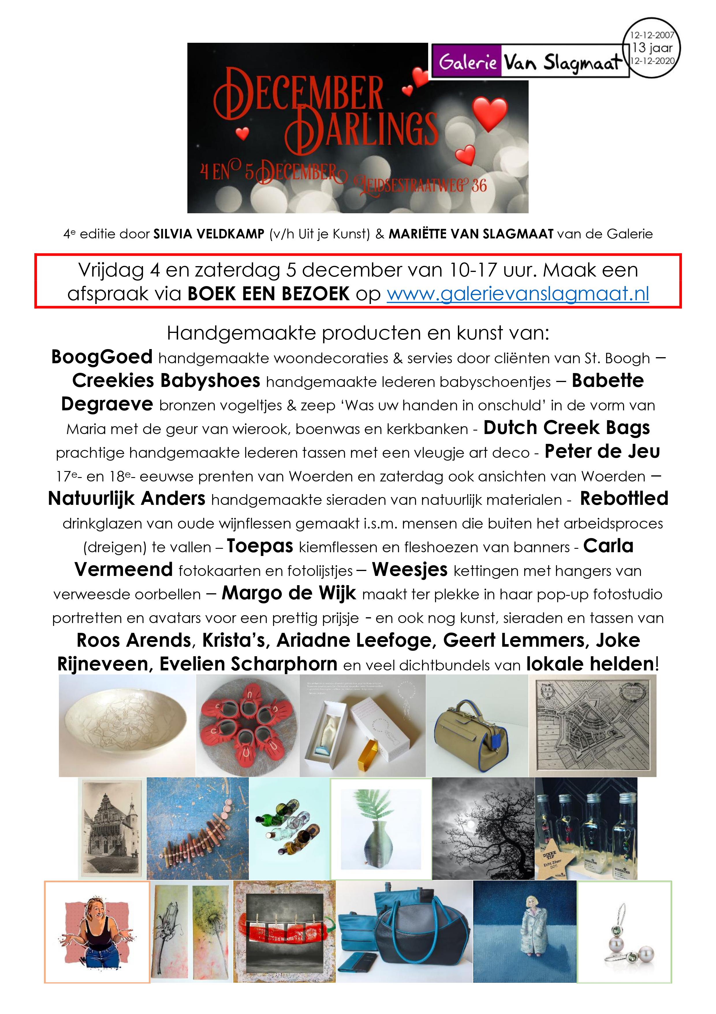 Met veel plezier nodigen Silvia Veldkamp (v/h mijn overbuuf bij Uit je Kunst – Conceptstore) en ik je uit voor de vierde editie van December Darlings! Dit jaar géén koopavond maar twee dagen om je te buiten te gaan aan de mooie handgemaakte producten en kunstwerken die we voor je hebben verzameld. Traditiegetrouw zijn een aantal makers aanwezig en dit jaar ook een verzamelaar dit items uit zijn collectie verkoopt. We ontvangen bezoek nog steeds op afspraak; zet nu al je afspraak in onze agenda via BOEK EEN BEZOEK. Wij zien je heel graag in de galerie! Groet van Silvia & Mariëtte