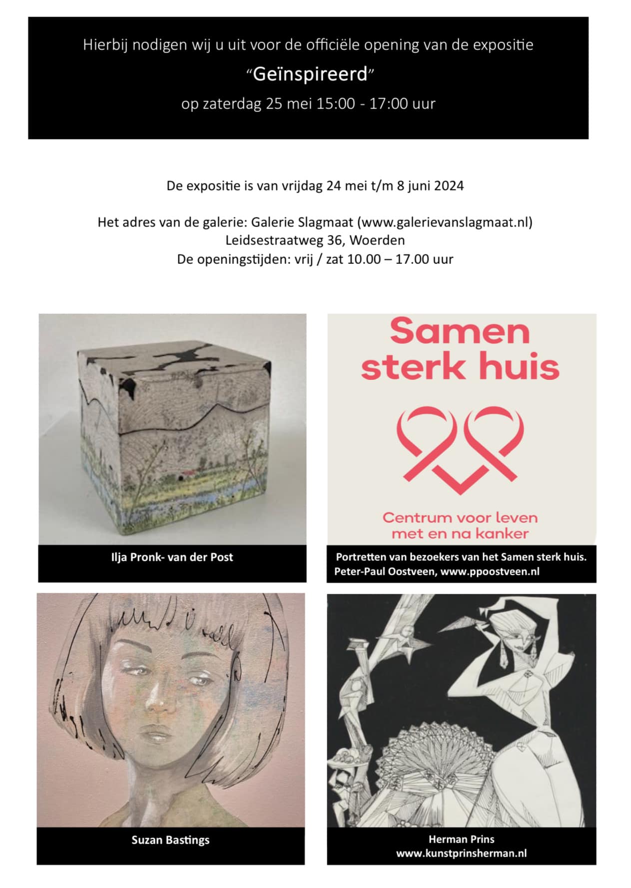Van 24 mei tm 8 juni 2024 is onder de titel ‘Geïnspireerd’ werk te zien van Ilja Pronk-van der Post, Peter-Paul Oostveen, Suzan Bastings en Herman Prins. De eerste drie bemannen samen de Expositieruimte en geven graag een toelichting op hun kunstwerken.