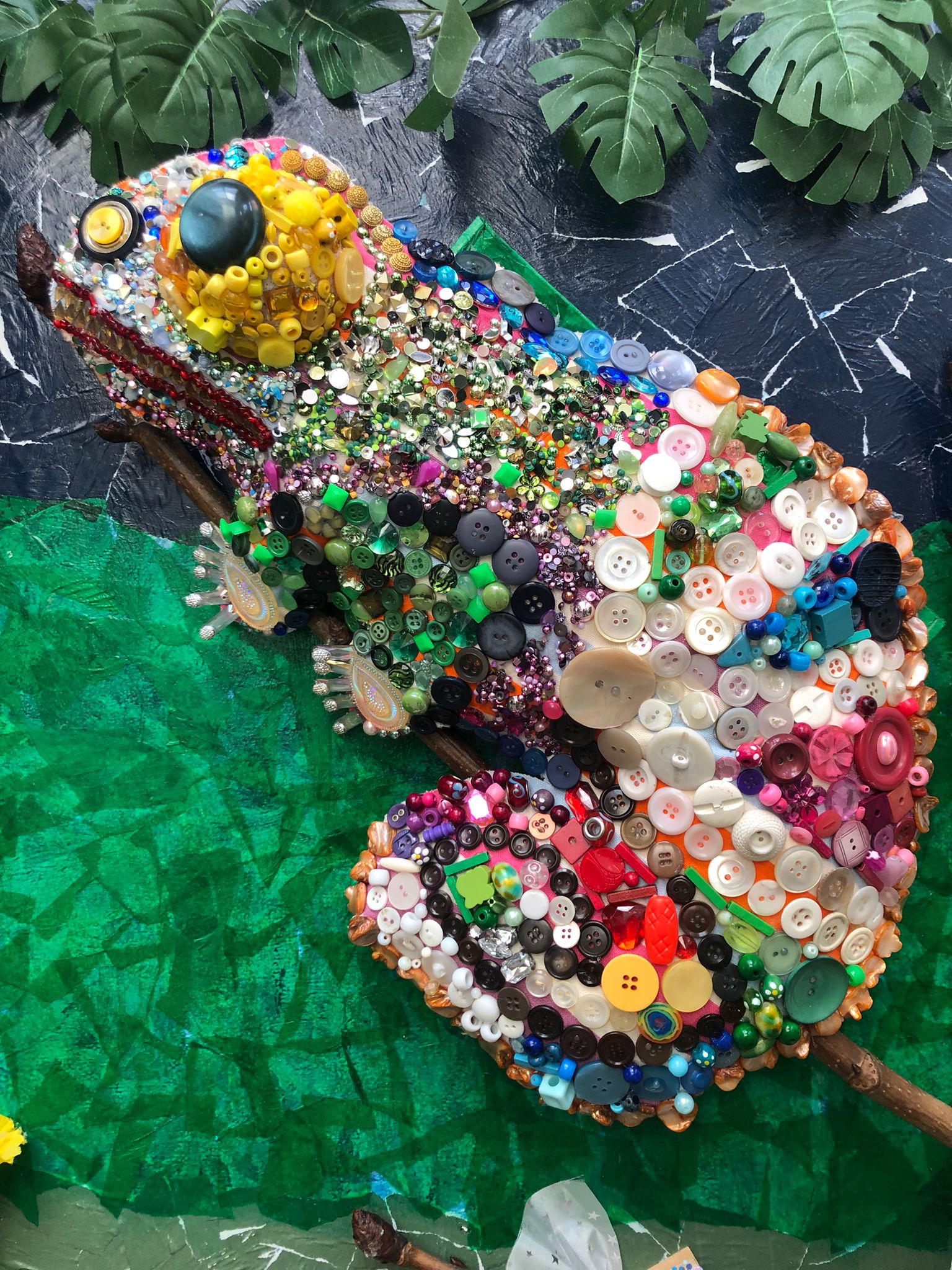 Ook te zien in de expositie Jong Talent & Verfrissende Kunst: ‘Kameleon’ van Wietske Hoogland (eindexamenklas VWO 22/23). Dit kleurrijke wandobject maakte ze onder andere van knopen en kralen die ze op zolder vond.