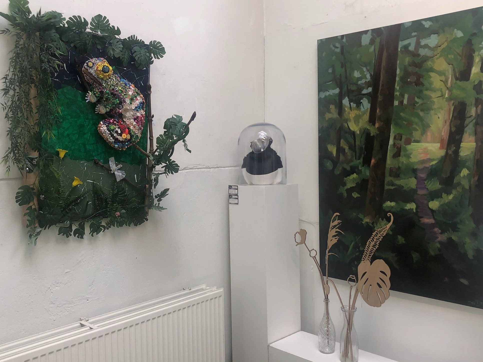 Ook te zien in de expositie Jong Talent & Verfrissende Kunst ‘Voorbij de Wolken’ van Minke Peeters (eindexamen VWO 22/23). Deze installatie (wand en vloer) vormt een drieluik in hout, klei, papier-maché en verf. Eindeloos geduld en gevoel voor verhoudingen maken dit kunstwerk tot een eye catcher, die niet zou misstaan in een bedrijfslobby!