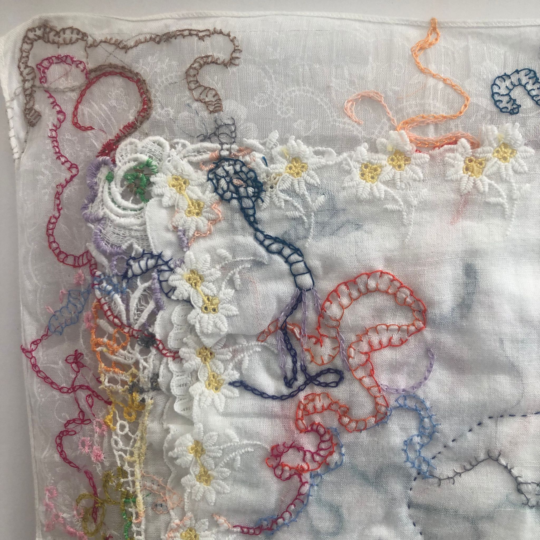 De kunstwerken van Conny Kruithof (1960 Zoetermeer; KABK, Den Haag) ademen een vleugje nostalgie. Ook haar werk heeft een permanent plekje verworven in de galerie. In de zomerexpositie is borduurwerk van haar hand te zien, maar ook krachtige tekeningen en aquarelen op vliegerpapier. De geborduurde collage van opengewerkte en geborduurde, ragfijne zakdoekjes van Conny’s tante en het vrije borduurwerk in wit tillen borduren naar een hoger niveau. De bijna woest getekende mannen op rood en in zwart openen je hart.