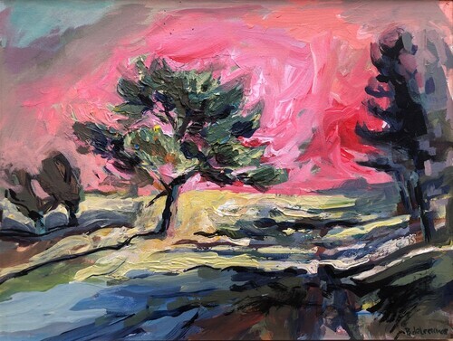 Boom met rood – Boris de Leeuwe, acryl op papier, 40 x 30 cm