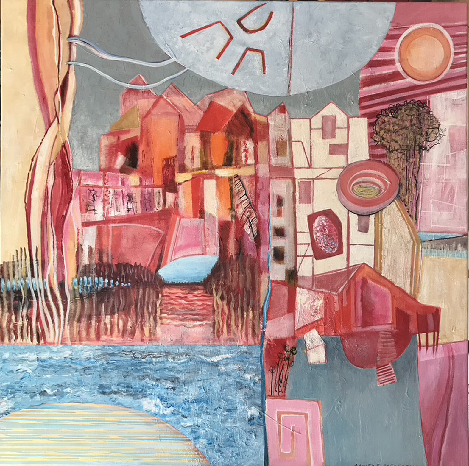 Anneke laat een verrukkelijke selectie van haar werk zien, met water als onuitputtelijke bron van inspiratie. Verhalend, wonderlijk, sprekend tot de verbeelding. Het lijkt alsof in haar recente schilderijen meer connectie te zien is, daar waar eerder losse elementen een fraaie compositie vormde. Ze laat in elk geval haar zachtere kant zien, wat kleur betreft: naast intens blauw en warmrood nu ook pastel.