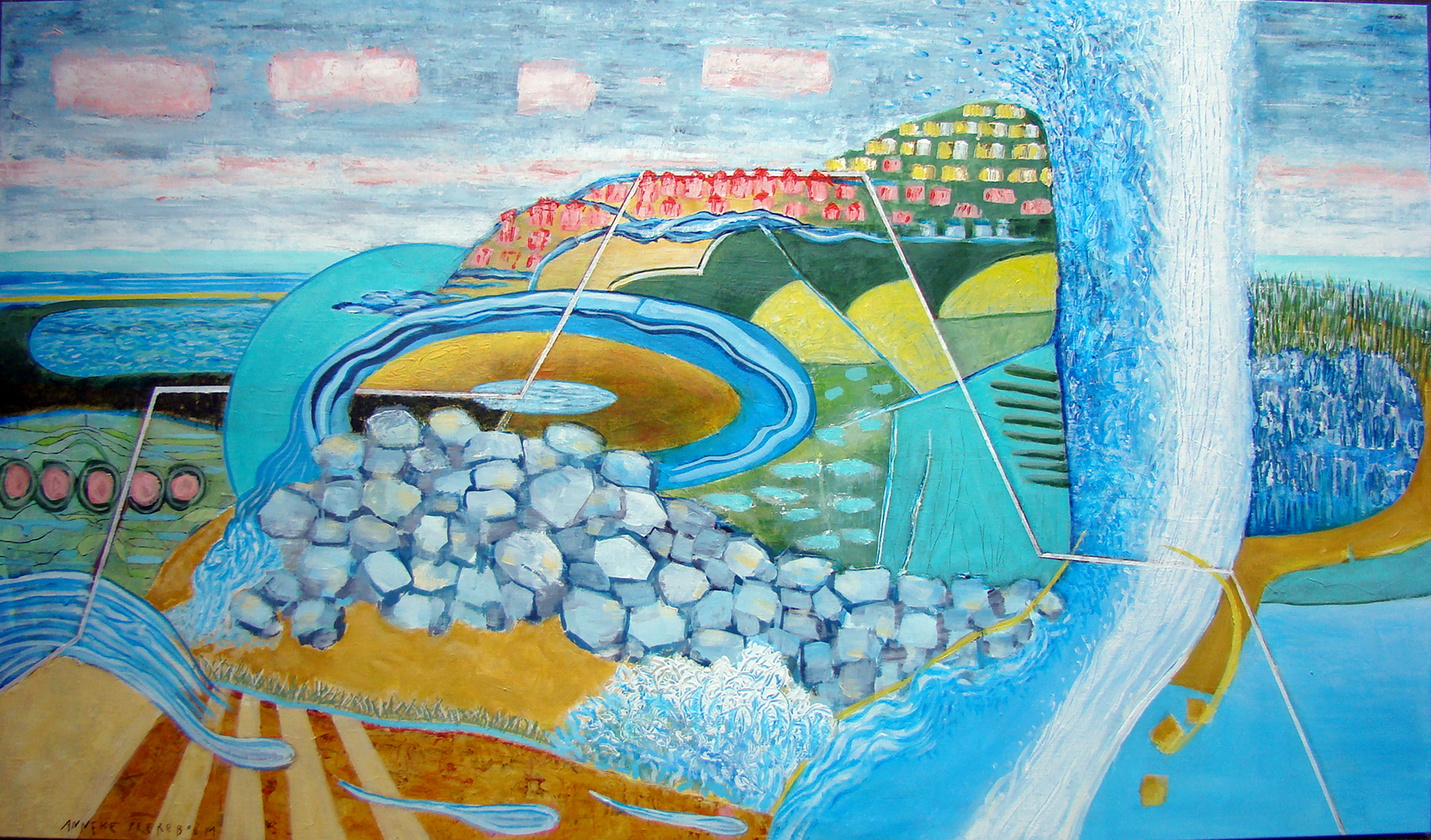 Water en Landen, scheiden en scheppen – Anneke Peereboom, acryl op doek, 80 x 140 cm