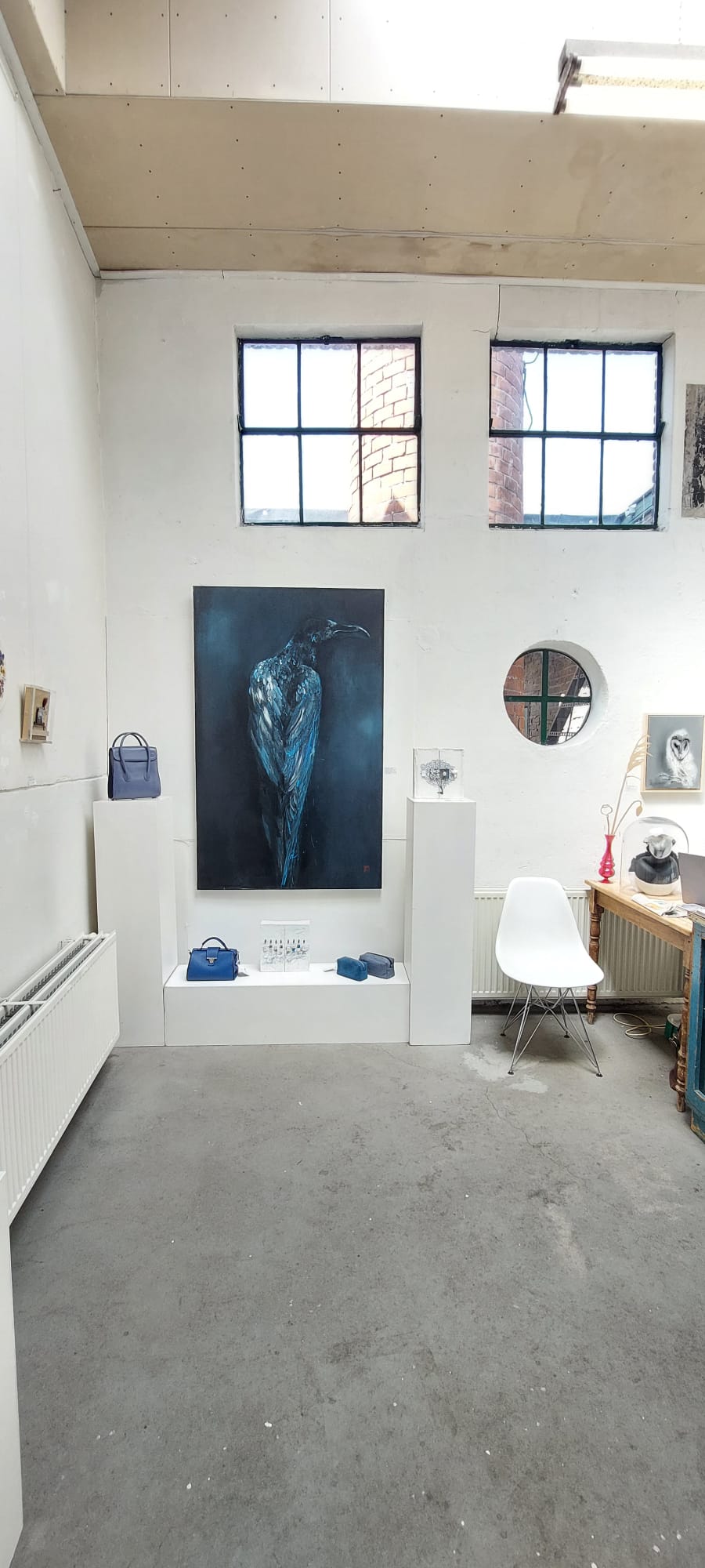 De nadruk in deze expositie ligt op dieren, vlot en toch trefzeker geschilderd door Dorien. Meestal op een lichte achtergrond, behalve Marabu en Blauwe Kraai, die sprankelen in hun verenkleed op een zwarte. Ze pakt heerlijk uit: een doek van 160 x 100 cm past prima!