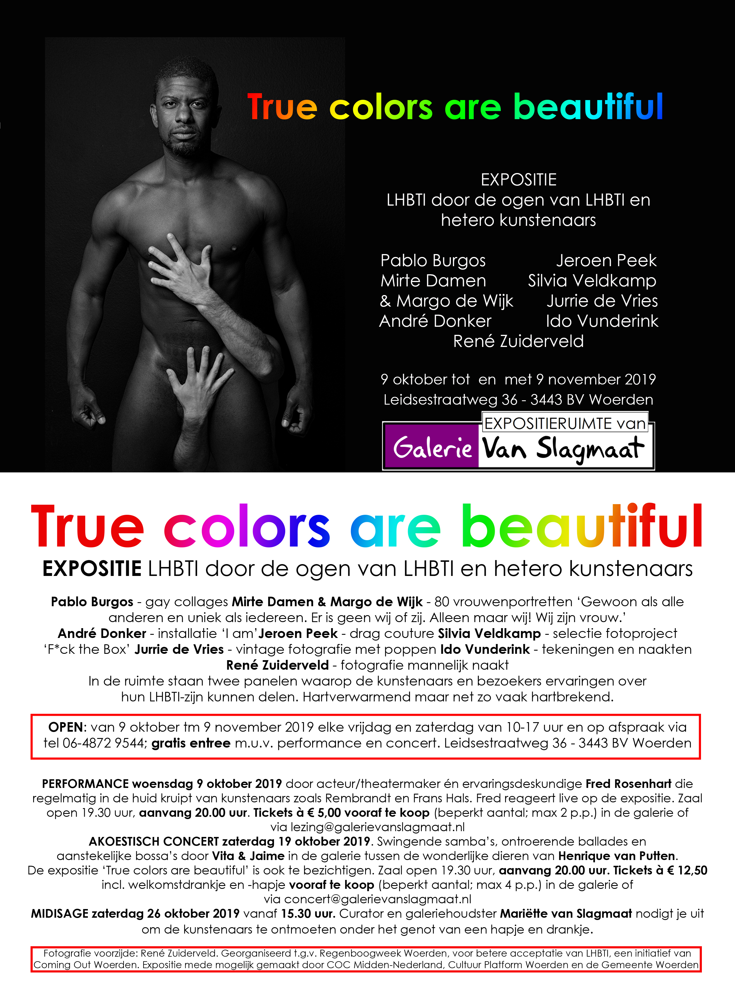 | Wo 9 oktober 2019 – Expositieruimte van & Galerie Van Slagmaat Lezing/performance door kunstenaar/acteur/theatermaker Fred Rosenhart. Fred laat vanuit historisch perspectief zijn licht schijnen over de expositie ‘True colors are beautiful’. Hij is ervaringsdeskundige en zet zich in de regio Kennemerland in voor de acceptatie van LHBTI. Aanvang 20.00 uur, duur circa 2 uur incl. pauze. Galerie open 19.30 uur. Een kaartje kost €5 en is vooraf te koop in de galerie of te bestellen via lezing@galerievanslagmaat.nl. LET OP: vanwege het beperkt aantal plaatsen max. 2 kaartjes per persoon! Het was een geweldig leuke avond! |