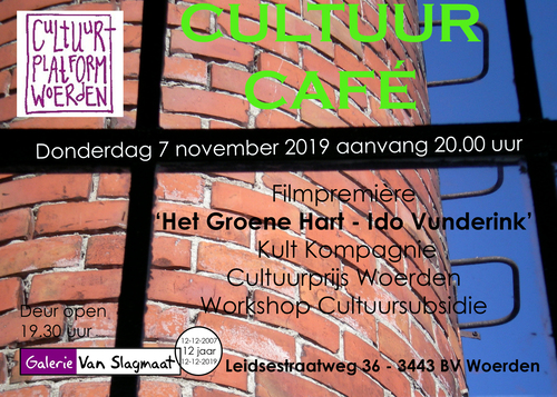 | Donderdag 7 november aanvang 20.00 uur, deur open 19.30 uur Cultuurcafé van Cultuur Platform Woerden in de galerie, voor cultuurmakers en cultuurgenieters. Gepresenteerd door uw geliefde galeriehoudster. Gevarieerd programma van een uur over culturele activiteiten in Woerden, kijk voor het programma hier. Daarna is er gelegenheid tot napraten en netwerken. |