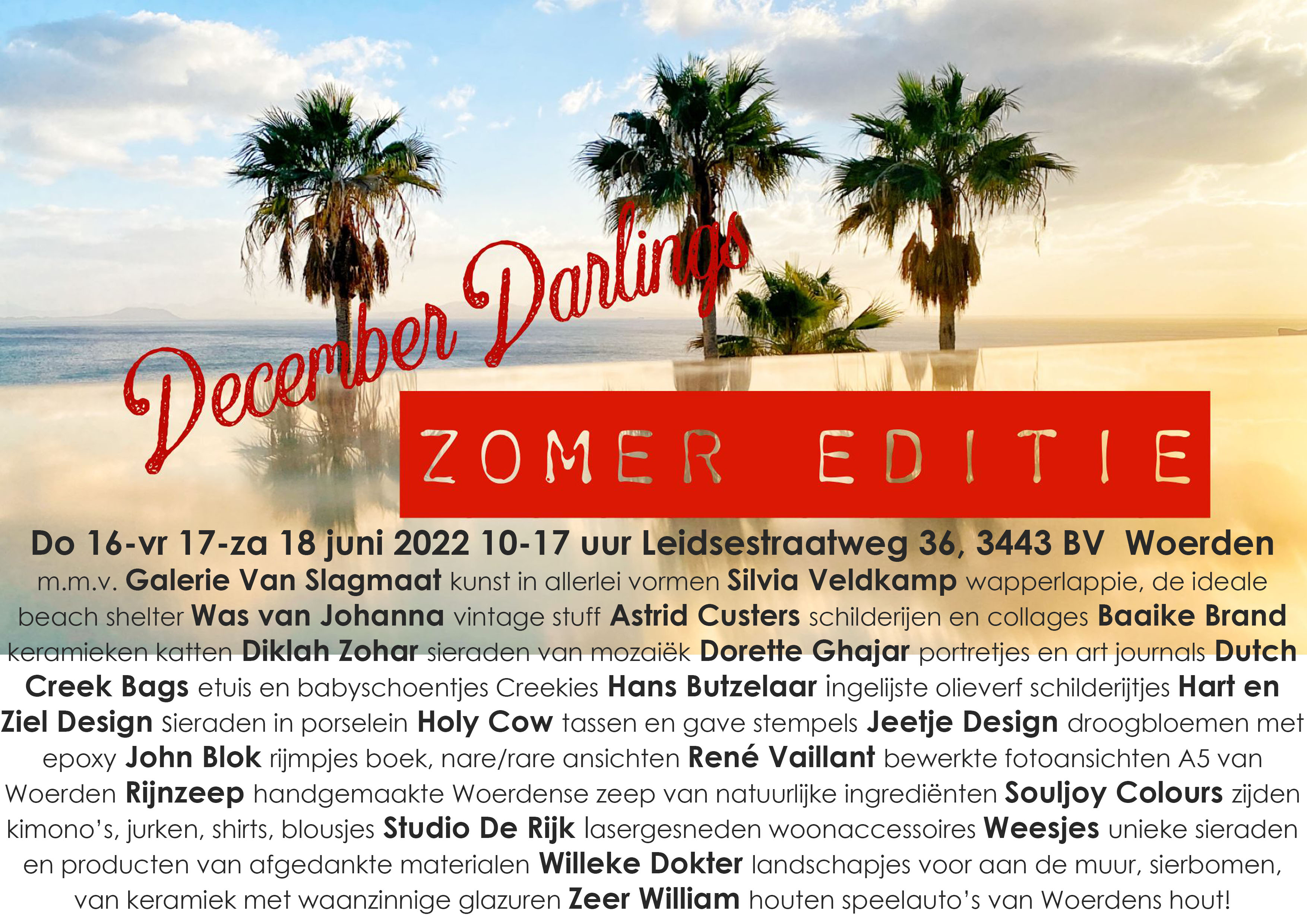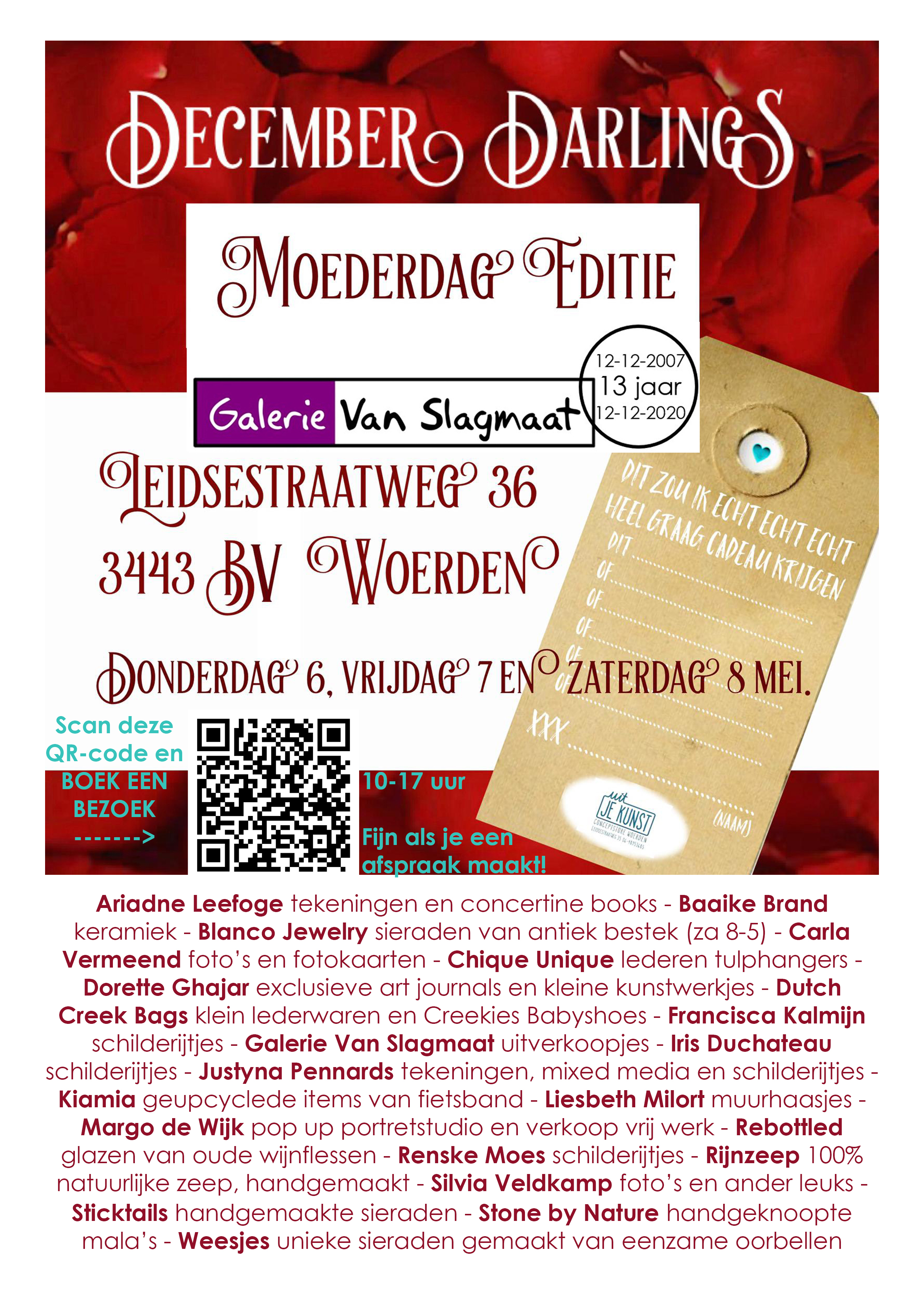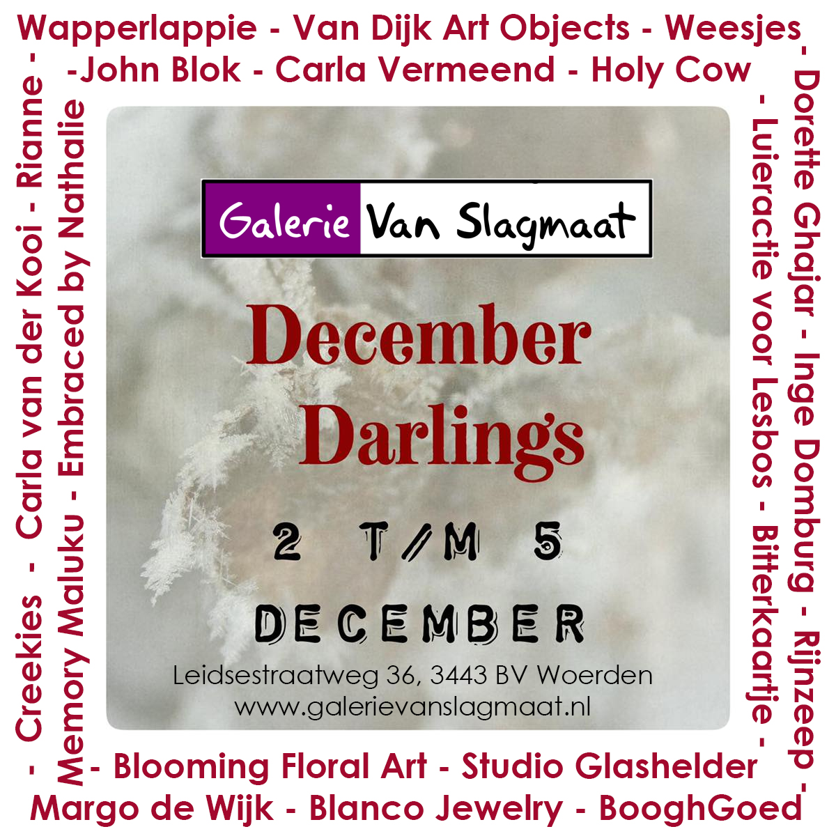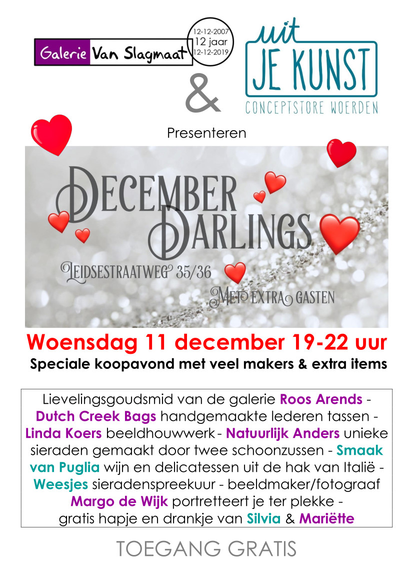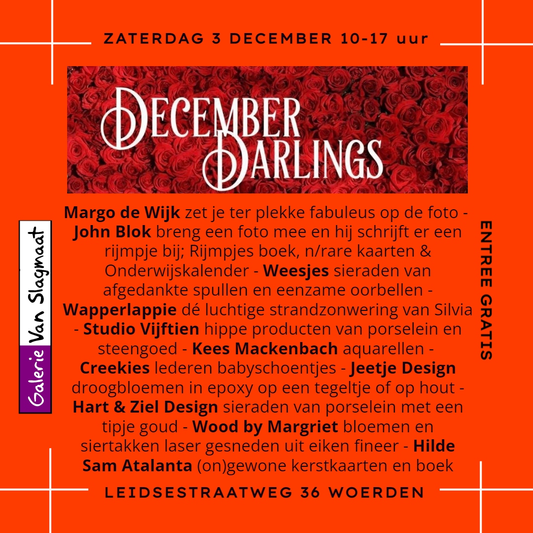 | Za 3 december 2022 – Galerie en Expositieruimte van Galerie Van Slagmaat De achtste editie van DECEMBER DARLINGS! Extra veel mooie, leuke en kunstzinnige items van meer dan tien aanbieders, voor elke portemonnee, in een co-productie met Silvia Veldkamp! KLIK OP DE AFBEELDING RECHTS VOOR MEER INFORMATIE Je kunt deze keer ter plekke een fabuleus portret voor je social media laten maken door Margo de Wijk of laat door John Blok een rijmpje maken bij één van jouw foto’s. Zijn boek, kaarten en kalender zijn ook verkrijgbaar. Natuurlijk kun je een Wapperlappie bestellen; hét alternatief voor een wegwaaiende parasol op het strand. Studio Vijftien is present met hippe producten van porselein en steengoed, zoals kopjes, schaaltjes en hangers (voor in je kerstboom?). Weesjes zijn er natúúrlijk ook bij, met sieraden en andere items gemaakt van afgedankte spullen en eenzame oorbellen. Kees Mackenbach schilderde prachtige aquarellen van (fantasie) landschappen en echte stadsgezichten, ook van Woerden! Corien wipt zaterdag even langs, zij is de ontwerpster van Creekies (lederen babyschoentjes) en van Dutch Creek Bags, tassen met internationale allure. Wood by Margriet laat zien wat de samenwerking tussen productdesigner Margriet Foolen en Woodsensation opleverde: bloemen en siertakken laser gesneden uit eiken fineer. Van Hart & Ziel Design hebben we fraaie sieraden van porselein met een tipje goud (en een paar in zilver!). Van Jeetje Design staan droogbloemen in epoxy op een tegeltje of op hout en de spotlights. Zoek je ongewone kerstkaarten, dan is Hilde Sam Atalanta ‘je man’. Hen is de bedenker van ‘The Vulva Gallery’, waarvan het boek te koop is in de galerie. Tot slot zijn daar de beeldige landlandschapjes van keramiste Willeke Dokter, die dit weekend voor het laatst te koop zijn in de galerie. |