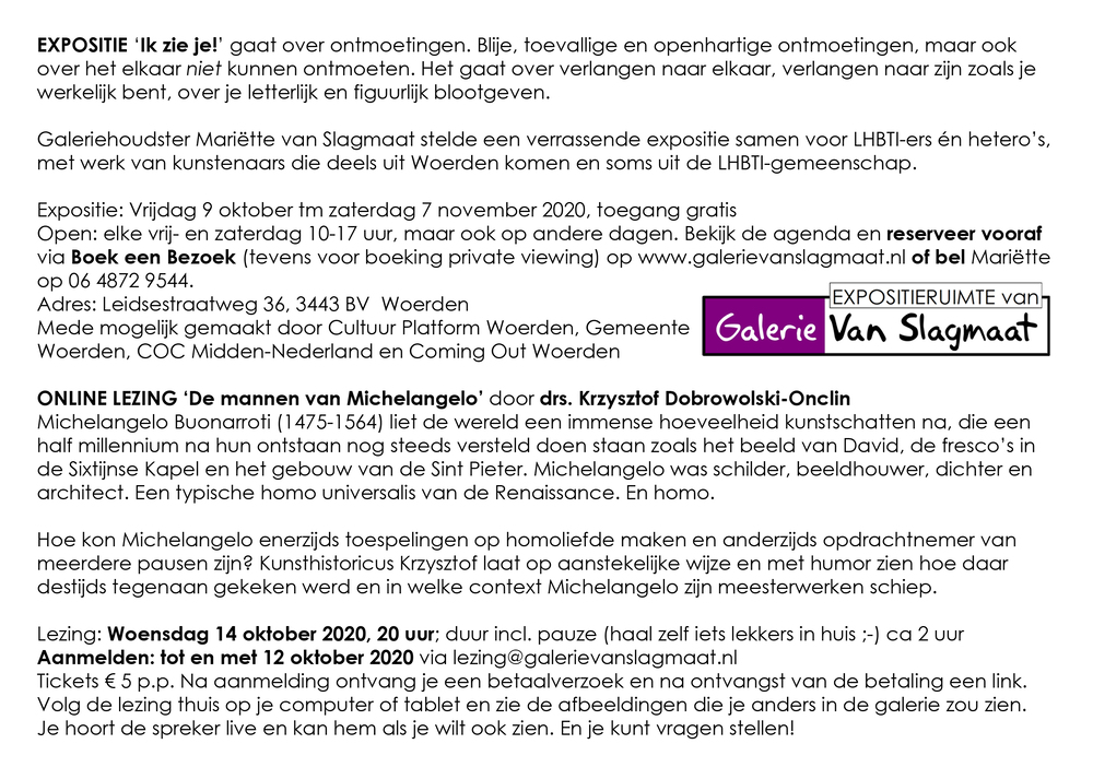 | Woensdag 14 oktober 2020 aanvang 20.00 uur Online lezing ‘De mannen van Michelangelo’ door kunsthistoricus Krzysztof Dobrowolski-Onclin ONLINE LEZING Ook dit jaar kun je in de Regenbookweek een toepasselijke kunstlezing verwachten. Vanwege de aangescherpte coronamaatregelen niet in Galerie Van Slagmaat, maar thuis op de bank! Volg de lezing thuis op je computer of tablet en zie de afbeeldingen die je anders in de galerie zou zien. Je hoort de spreker live en kan hem als je wilt ook zien. En je kunt vragen stellen! ‘De mannen van Michelangelo’ door drs. Krzysztof Dobrowolski-Onclin Michelangelo Buonarroti (1475-1564) liet de wereld een immense hoeveelheid kunstschatten na, die een half millennium na hun ontstaan nog steeds versteld doen staan zoals het beeld van David, de fresco’s in de Sixtijnse Kapel en het gebouw van de Sint Pieter. Michelangelo was schilder, beeldhouwer, dichter en architect. Een typische homo universalis van de Renaissance. En homo. Hoe kon Michelangelo enerzijds toespelingen op homoliefde maken en anderzijds opdrachtnemer van meerdere pausen zijn? Kunsthistoricus Krzysztof laat op aanstekelijke wijze en met humor zien hoe daar destijds tegenaan gekeken werd en in welke context Michelangelo zijn meesterwerken schiep. Wanneer: Woensdag 14 oktober 2020, 20 uur; duur incl. pauze (haal zelf iets lekkers in huis ;-) ca 2 uur Aanmelden: tot en met 12 oktober 2020 via lezing@galerievanslagmaat.nl Tickets: € 5 p.p. Na aanmelding ontvang je een betaalverzoek en na ontvangst van de betaling een link. Donaties zijn welkom, want we missen de inkomsten uit drankjes die nodig zijn om de kosten te dekken. Thx! |
