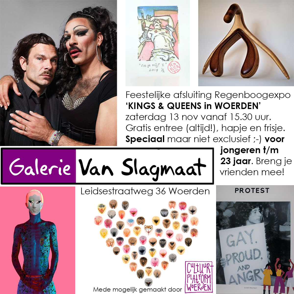 | Do 14 oktober tm za 13 november 2021 – Expositieruimte Kings & Queens in Woerden Het fotoproject ‘Kings & Queens’ van Léon Hendrickx en Snorella WC/Micha Schneijderberg vult dit jaar de muren van de Expositieruimte. Het is enerzijds een fotografisch hoogstandje - drag queens in een innige omhelzing met hun mannelijke zelf – en anderzijds een ontroerende ontmoeting van twee varianten van dezelfde persoon, die allebei levensecht zijn. Illustrator Hilde Atalanta is non binair en de viering van diversiteit in leeftijd, huidskleur, geslacht en seksualiteit loopt als een rode draad door diens werk. In de expositie zijn items te koop van ‘The Vulva Gallery’ zoals het boek, een kwartetspel en kerstkaarten. Van de ‘You’re Welcome Club’, die staat voor diversiteit en inclusiviteit, zijn pins, een kleurboek en ansichtkaarten te koop. LP Hout van de Woerdense Lex Polman zorgt voor een testosteronbommetje met sensuele streelbeelden van hout. Doe je ogen dicht en voel! Veerle Berk laat haar indrukwekkend eindexamenwerkstuk ‘PROTEST’ zien. Ga er even bij zitten, lees én kom zelf in actie tegen onrecht. |