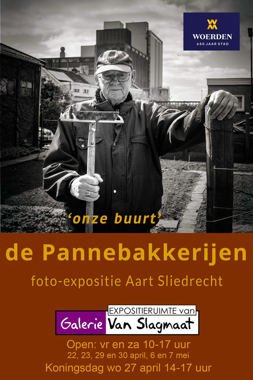 | Vr 23 april tm za 7 mei – Expositieruimte Expositie ‘De Pannebakkerijen – onze buurt’ door Aart Sliedrecht De Woerdense fotograaf Aart Sliedrecht maakte een documentaire fotoreportage over het Woerdense buurtje Pannebakkerijen en haar bewoners. Uw galeriehoudster was curator van deze expositie die haar na aan het hart ligt omdat ze houdt van buurtjes en het sfeertje dat daar hangt en ook omdat de Leidsestraatweg vroeger Pannebakkerijen heette. De expositie en Aart zijn te zien op vrij- en zaterdag van 10-17 uur (22, 23, 29 en 30 april en 6 en 7 mei) en op Koningsdag woensdag 27 april van 14-17 uur. |