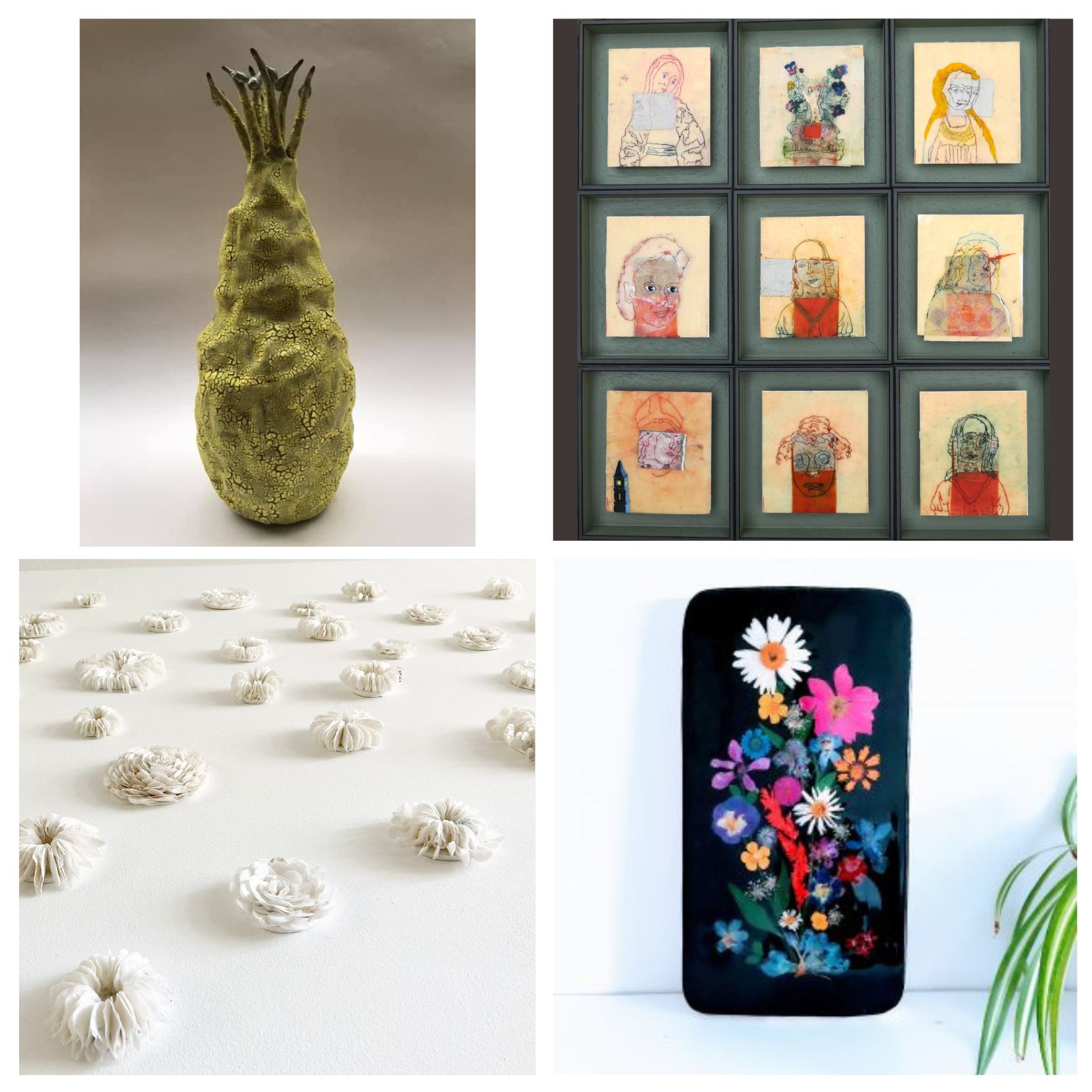| vr 15 juli tm za 27 aug 2022 – Galerie Gevarieerde expositie met keramiek van Willeke Dokter (1961 Amsterdam: SBB Gouda) en schilderijen en tekeningen in gemengde techniek van Conny Kruithof (1960 Zoetermeer; KABK, Den Haag). Hun kunst wordt geflankeerd door de tere en tegelijkertijd stoere papieren wandbloemen van Imre van Buuren (1969; KABK Den Haag) en door de houten panelen en tegels met droogbloemen in een modern jasje van Jeetje Design. |