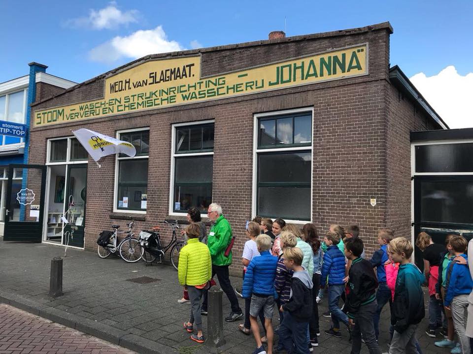 | Vr 13 september 2019 – Galerie Van Slagmaat Open Monumenten Klassendag 132 leerlingen uit groep 7 en 8 bezoeken de galerie, gevestigd in een gemeentelijk en industrieel monument. Al vele jaren gids ik hen door de geschiedenis van het pand waarin Wasserij Johanna gevestigd was. Ik haak met mijn verhaal in op het jaarthema, laat foto’s zien en richt een mini-expositie in. Het is harstikke leuk! |