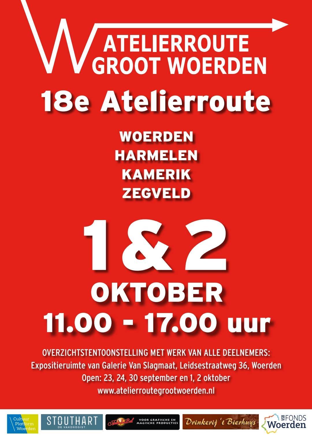 | Vr 27 september 2019 – Expositieruimte van Galerie Van Slagmaat Overzichtstentoonstelling waarin de 56 deelnemers aan Atelierroute Groot Woerden 2019 ieder één werk exposeren. Za 5 en zo 6 oktober – o.a. Expositieruimte en Galerie Van Slagmaat Open van 10-17 uur vanwege Atelierroute Groot Woerden, de overige 33 locaties zijn open van 10-18 uur. Boekjes met info over en adressen van deelnemers zijn nu al verkrijgbaar à € 2 |