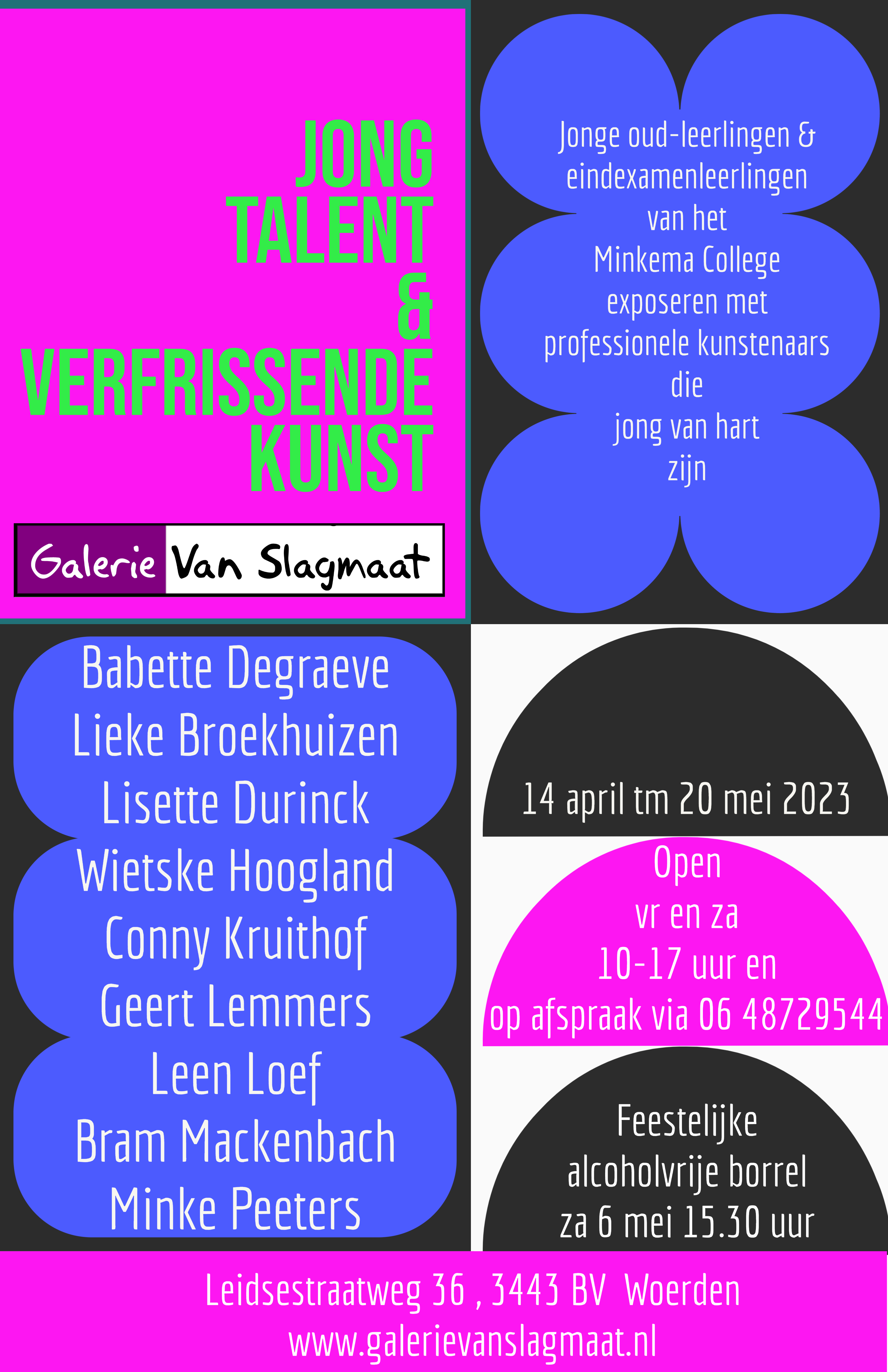 | Vr 14 april tm za 20 mei 2023 – Galerie JONG TALENT & VERFRISSENDE KUNST Jonge oud-leerlingen van het Minkema College exposeren met professionele kunstenaars die jong van hart zijn. Kijk op HOME voor meer informatie! |