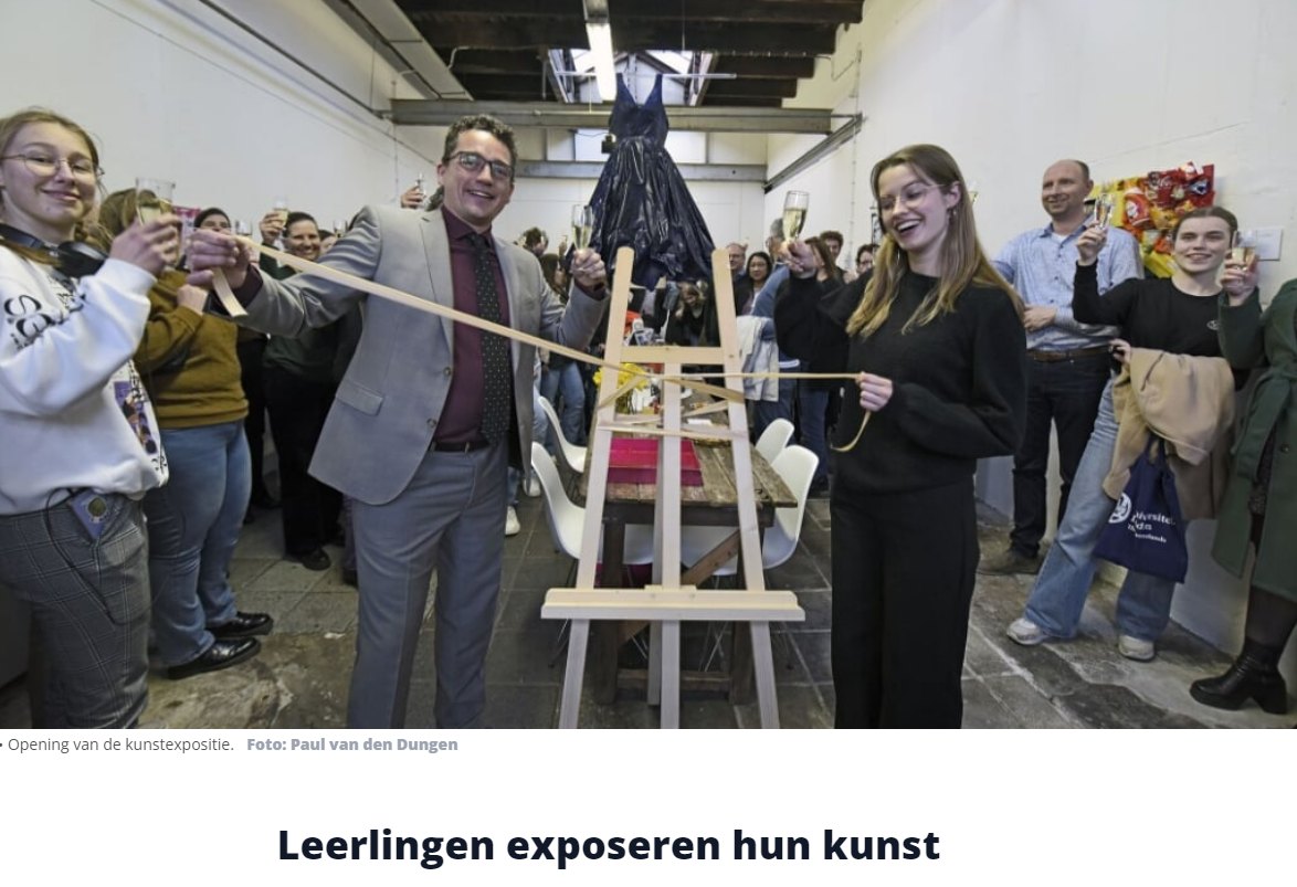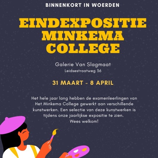 | Do 29 mrt tm za 8 apr 2023 – Expositieruimte van de Galerie Eindexamenexpositie van havo- en vwo-leerlingen van het Minkema College in Woerden. Van iedere leerling is minstens één kunstwerk te zien, en vaak ook hun ‘dummy’, een wart cahier waarin het proces over de totstandkoming van het kunstwerk is vastgelegd in woord en beeld. De expositie is op donderdag 29 maart 2023 onder grote belangstelling officieel geopend door de wethouder van cultuur van Woerden, zelf oud-leerling van het Minkema, de heer Jelmer Vierstra en leerling Inez Kallenfels. |