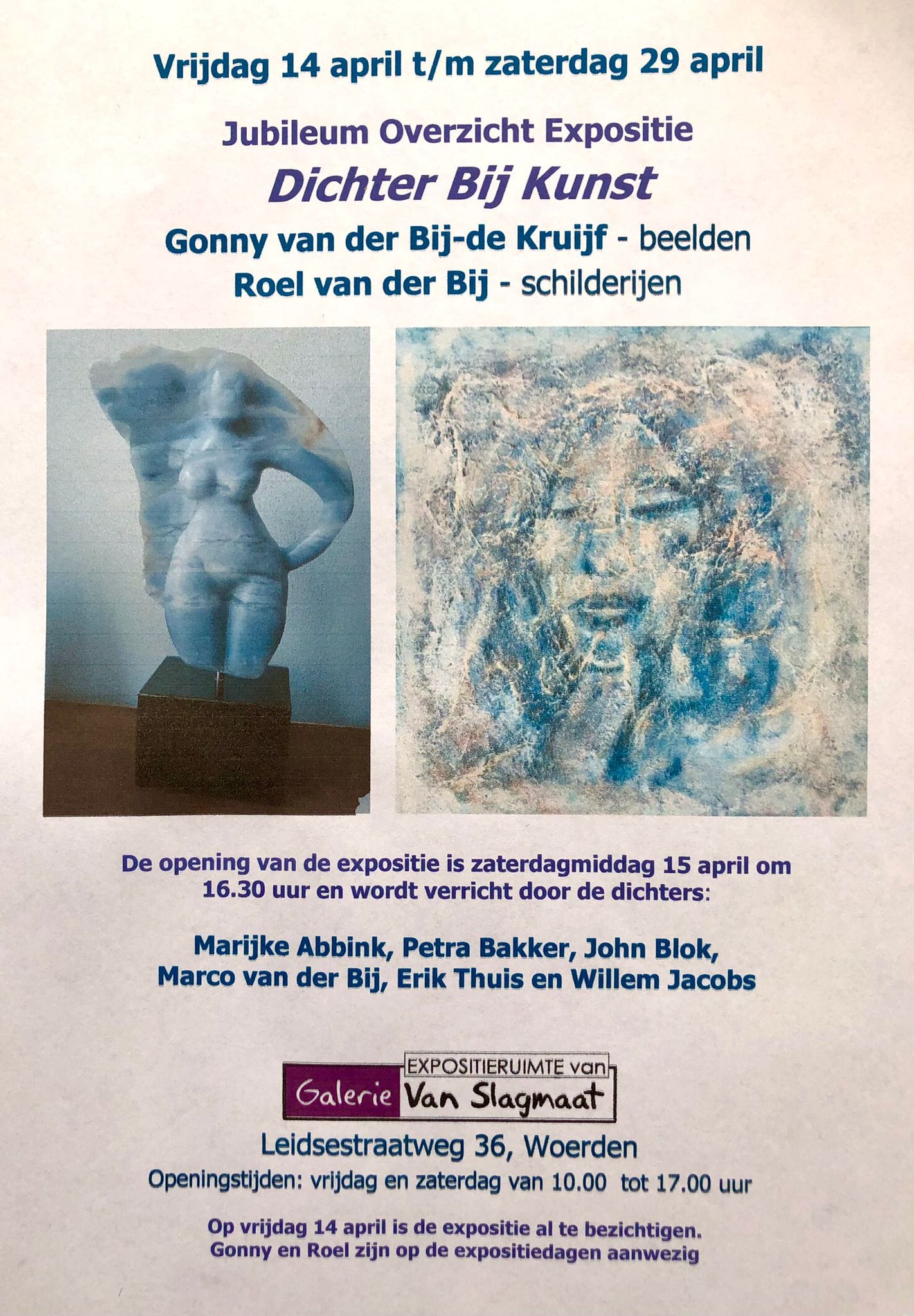 | Vr 14 tm za 29 april 2023 – Expositieruimte van de Galerie Jubileum-overzichtsexpositie van Gonny van der Bij-de Kruijf (beelden) en Roel van der Bij (schilderijen), vanwege hun beider 75-jarig bestaan! Hun kunst wordt omlijst oor gedichten van Marijke Abbink, Petra Bakker, John Blok, Marco van der Bij, Erik Thuis en Willem Jacobs. De officiële opening van de expositie was zaterdag 15 april 2023 om 16.30 uur en werd verricht door de dichters. |