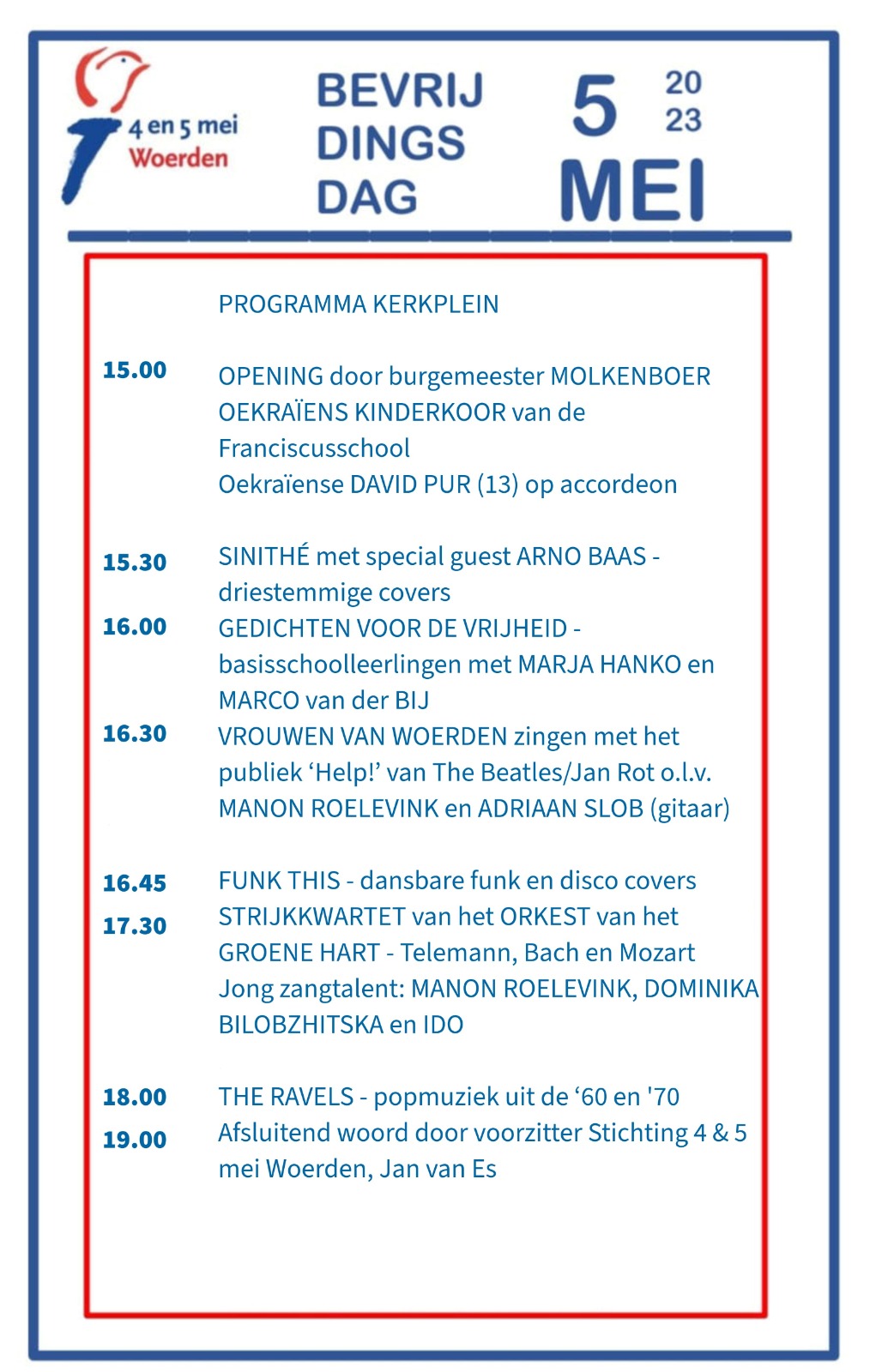 | Vr 5 mei 2023 – Kerkplein Woerden Vrijdag 5 mei organiseert Stichting 4&5 mei Woerden van 15-19 uur een Bevrijdingsfeest op het Kerkplein in Woerden. De presentatie is in handen van uw galeriehoudster – whoop whoop! We hebben een geweldige, gevarieerde line up! Klik op het programma (zie rechts) voor een vergroting. See you! |