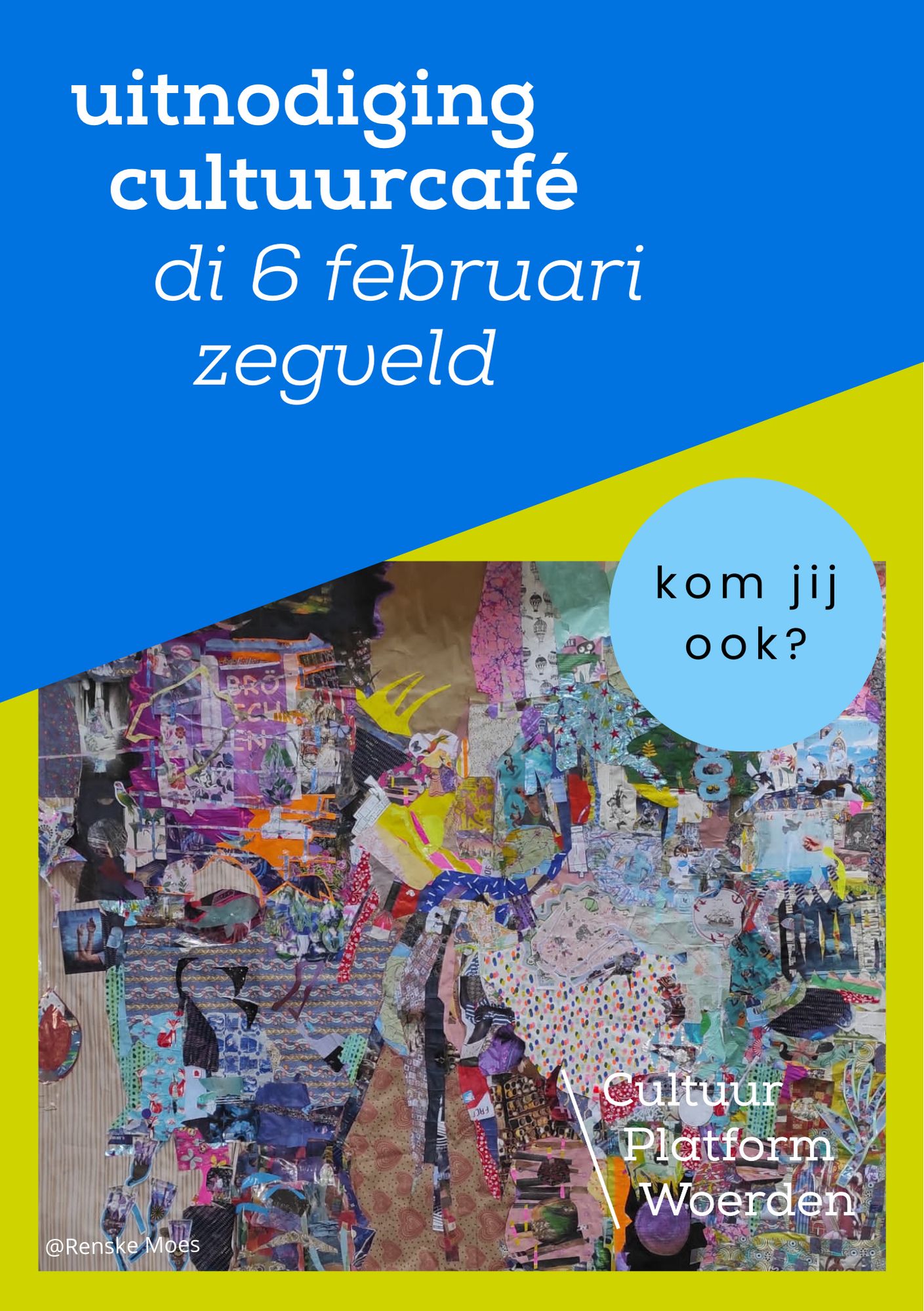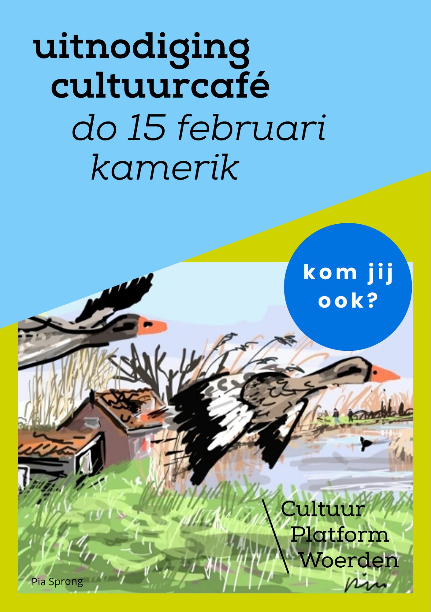 | Di 6 feb 2024 – Zegveld, Gasterij De Milandhof Polderzaal, 20 u Cultuurcafé on Tour in Zegveld, Kamerik (do 15 feb) en Harmelen (do 29 feb), gepresenteerd door uw galeriehoudster. Voor Cultuur Platform Woerden organiseer ik samen met héle leuke vrijwilligers Cultuurcafés voor cultuurmakers en cultuurbelevers. Een gevarieerd programma van één uur en daarna lekker netwerken - of kletsen. In Zegveld zijn we te gast bij Kunst na Arbeid. Klik hier voor de programma’s, die op elke locatie anders zijn. |