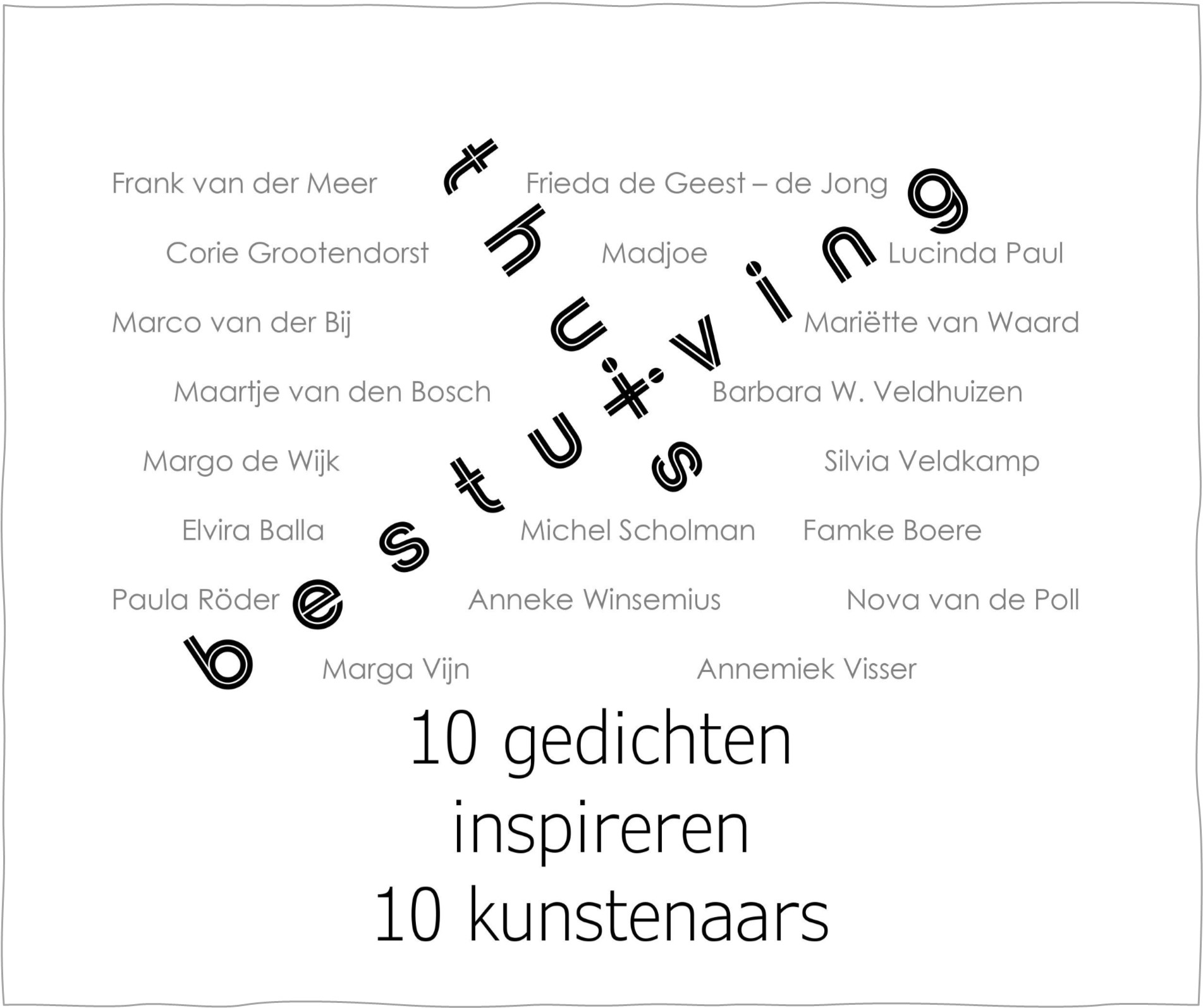 | Za 11 mei 2024 15.30 uur – Expositieruimte Je bent van harte welkom bij de officiële opening van de expositie Thuisbestuiving, in aanwezigheid van dichters en kunstenaars: Ronald E. Aalten, Elvira Balla, Marco van der Bij, Famke Boere, Maartje van den Bosch, Frieda de Geest – de Jong, Corie Grootendorst, Madjoe, Frank van der Meer, Lucinda Paul, Nova van de Poll, Paula Röder, Michel Scholman, Barbara W. Veldhuijzen, Silvia Veldkamp, Marga Vijn, Annemiek Visser, Mariëtte van Waard, Anneke Winsemius en Margo de Wijk. |
