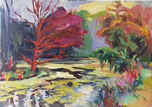 | Vr 24 jan tm za 22 mrt 2025 – Galerie Duo-expositie ‘Ontmoeting over land - Verlangen naar Verten’ van Ine van Loon en Margriet Gehrels De grote schilderijen in olieverf van Ine balanceren tussen realisme en abstractie. Ze gaat tijdens het schilderen helemaal op in haar oneindige, verdwaalde landschappen, ver weg van de oppervlakkigheid van het leven. De verstilling, vertraging en reflectie heeft ze nodig in deze wereld, die meer en meer van ons vraagt en onzekerheden met zich meebrengt. Margriet noemt het Fernweh: het tegenovergestelde van heimwee; een intens verlangen naar verre bestemmingen en onbekende plaatsen. Zij geeft met desolate landschappen, kleine objecten en installaties vorm aan haar reis. Naar een doel dat altijd op afstand is, dat niet te vangen is, tussen je vingers doorglipt wanneer je er bijna bent. Een ongrijpbaar verlangen. Ine en Margriet laten ons meedeinen op hun tocht met onbereikbaar doel, dwalend door het nu. Want zijn we uiteindelijk niet allemaal altijd op weg? Feestelijke opening zaterdag 25 januari 2025 15.30 uur in aanwezigheid van beide kunstenaressen. Je bent hierbij van harte welkom! |