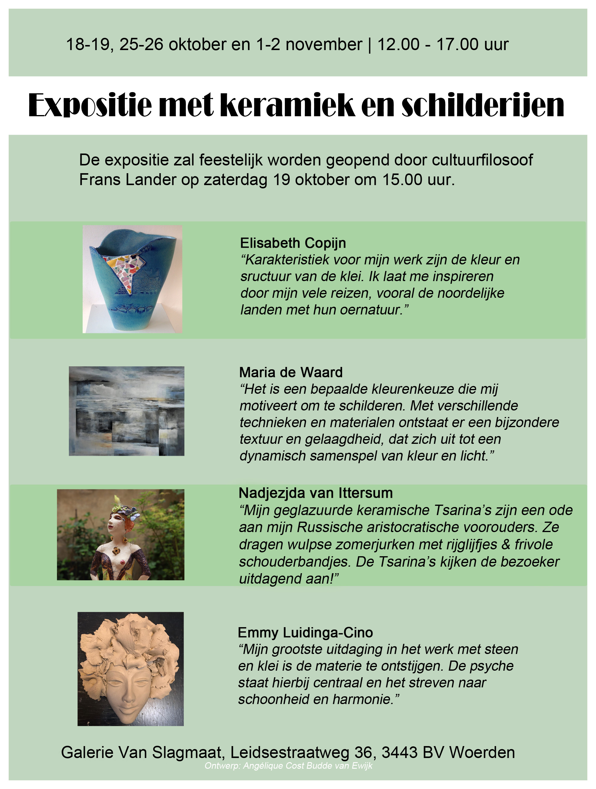 | Vr 18 okt tm za 2 nov 2024 – Expositieruimte Expositie met keramiek en schilderijen van Elisabeth Copijn, Maria de Waard, Nadjezjda van Ittersum en de Woerdense Emmy Luidinga-Cino. U bent van harte welkom bij de feestelijke opening op zaterdag 19 oktober 2024 om 15.00 uur door cultuurfilosoof Frans Lander. Klik op de foto rechts om meer te lezen over de exposanten. |