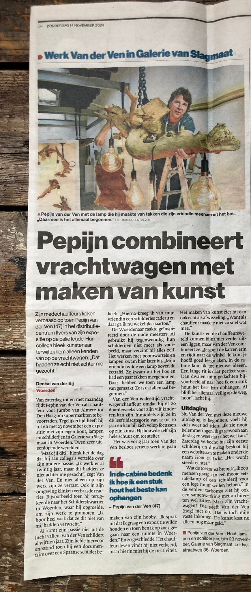 | Vr 8 tm za 23 nov 2024 – Expositieruimte De Woerdense Pepijn van der Ven huurde de expositieruimte voor zijn eerste expositie. Een hele bijzondere expositie, met olieverf schilderijen (traditioneel geschilderd met verf die hij zelf maakt van pigmenten) en prachtige, unieke lampen van hout met LED-verlichting, uiteraard ook door hem vervaardigd. De expositie is te zien van 8 tm 23 november 2024, geopend op vrij- en zaterdag van 10-17 uur. Pepijn is zelf aanwezig om je meer te vertellen over hun kunstwerken. Klik hier voor een heel leuk interview door Denise van der Bij met een foto van Rianne den Balvert voor het AD Woerden/Groene Hart. |
