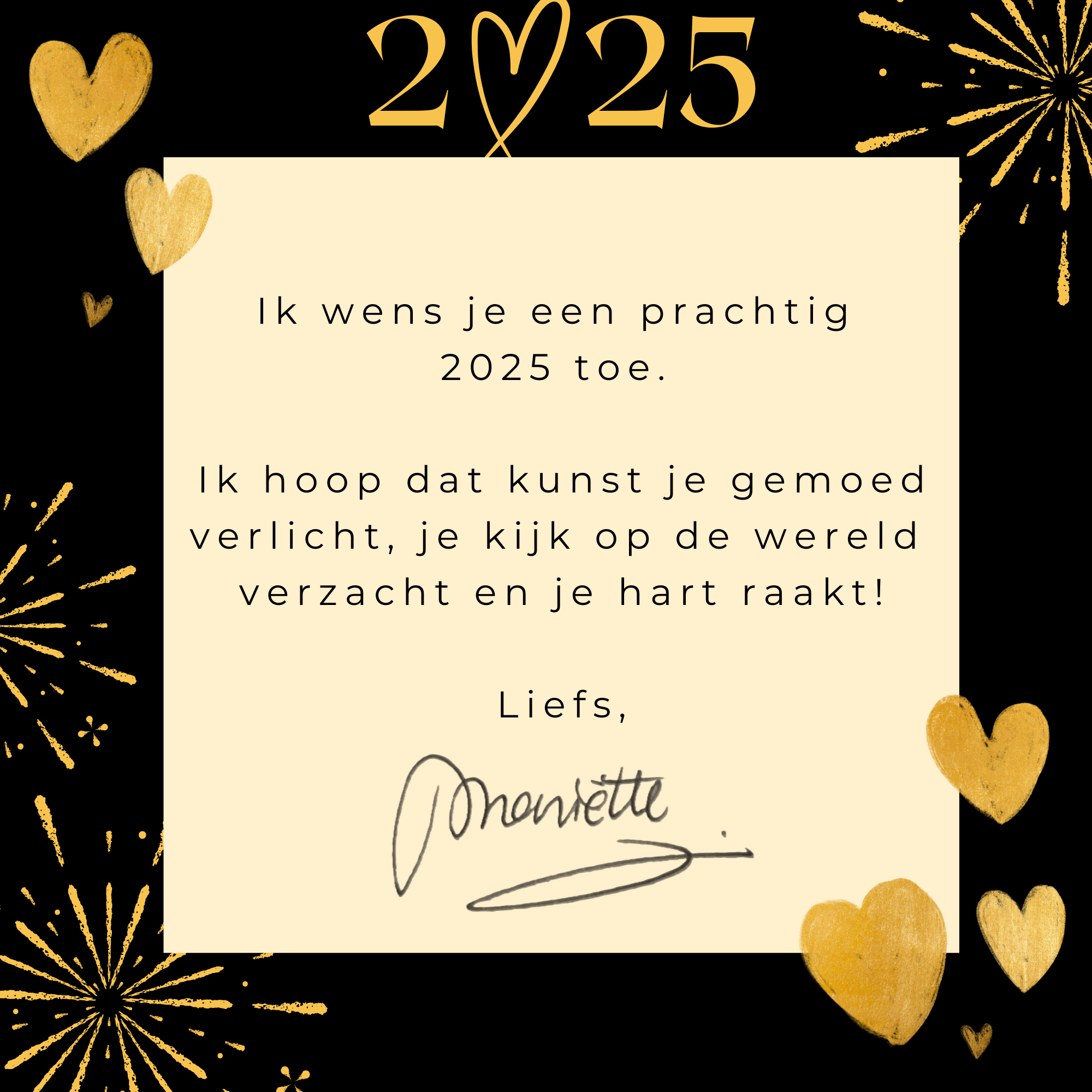 | Vr 27 dec 2024 tm za 4 jan 2025 – Galerie en Expositieruimte Gesloten. Ik wens je een prachtig 2025 toe. Ik hoop dat kunst je gemoed verlicht, je kijk op de wereld verzacht en je hart raakt! Liefs, Mariëtte |