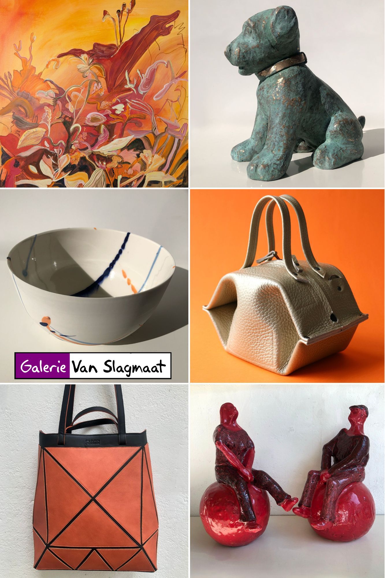 | Vr 4 april tm za 10 mei 2025 – Galerie Het is lente en dat vieren we met een kleurrijke expositie! Kunstschilder Justyna Pennards-Sycz is in haar bloemenfase, iets dat uitstekend past bij haar uitbundige kleurgebruik. De collectie lieve bronsjes van Babette Degraeve is uitgebreid met een paar pareltjes. Hanke Wiegand maakte in keramiek mannen en vrouwen die vrolijk door het leven stuiteren op een skippybal. De porseleinen schalen van Ceramics by Carlie met hier en daar een verfijnde gekleurde streep passen mooi in het geheel. De kleurrijke lederen tassen van Dutch Creek Bags en Frrry maken de expositie áf! |