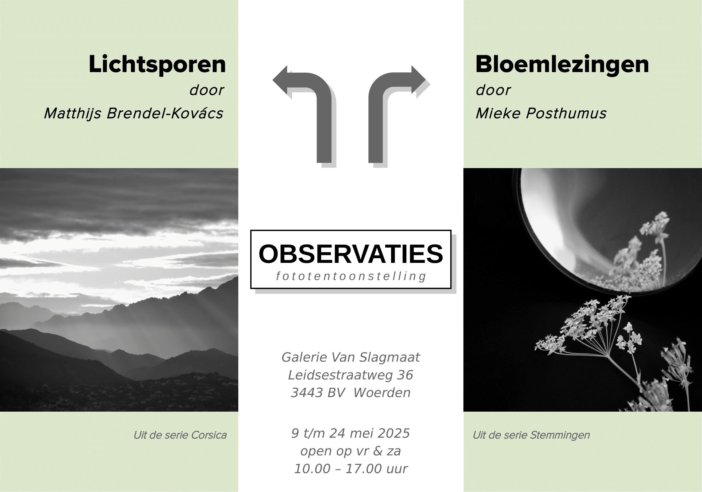 | Vr 9 tm za 24 mei 2025 – Expositieruimte Duo-fototentoonstelling OBSERVATIES. In een haastige en luidruchtige wereld nodigt deze expositie juist uit tot vertraging en bedachtzaamheid. Twee fotografen, elk met een eigen blik, tonen hun werk in verstilde beelden die fluisteren in plaats van roepen. Matthijs Brendel-Kovács en Mieke Posthumus kennen elkaar van de fotografieopleiding van Statief in Utrecht, en vonden wederzijdse herkenning in een stijl die draait om ingetogenheid, met aandacht voor schoonheid en essentie. Matthijs vindt dit vooral in spontane verkenning van de buitenwereld, terwijl Mieke juist werkt vanuit een vooraf bedacht concept. Matthijs is aanwezig op 9, 10, 16 en 24 mei en Mieke is aanwezig op 9, 17, 23 en 24 mei. |