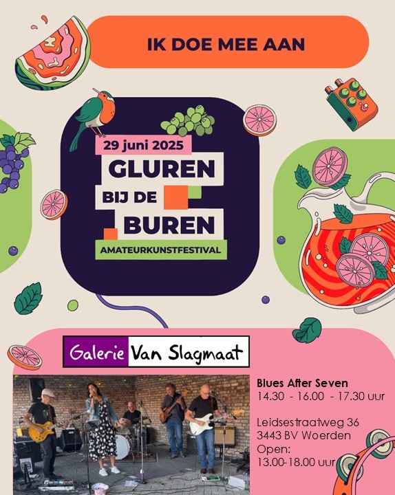 | Zo 29 juni 2025 – Galerie en Expositieruimte 13-18 uur Blues After Seven speelt heerlijke blues en jazz, tijdens de tiende editie van Gluren bij de Buren. Ze treden op om 14.30, 16.00 en 17.30 uur. Kom genieten van deze fijne vijfkoppige formatie en pak ook nog een vleugje lokale dichtkunst mee! Entree gratis, maar wel graag een donatie in de pot voor de organisatie en band. |