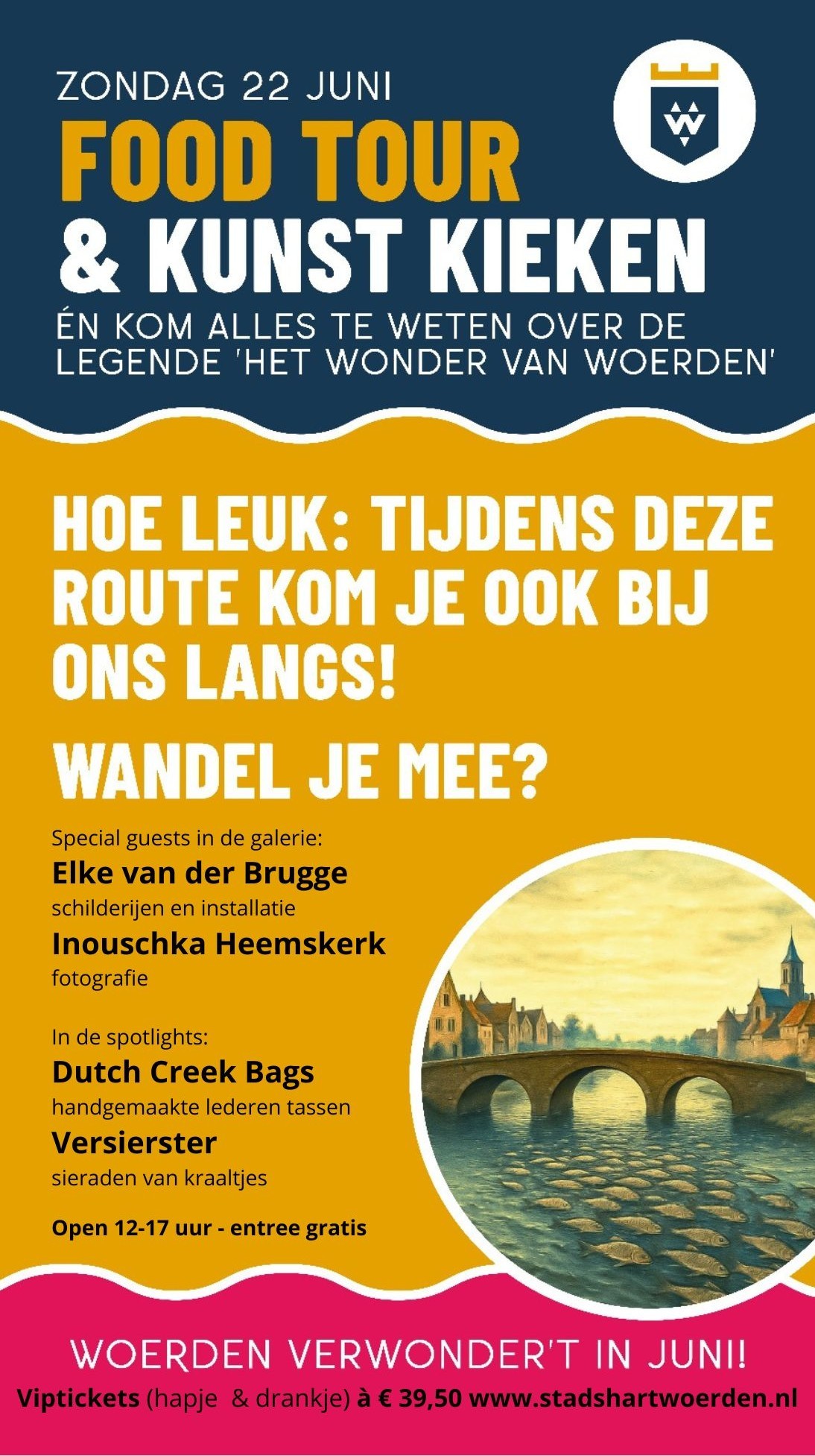 | Zo 22 juni 2025 – Galerie en Expositieruimte 12-17 uur Zondag 22 juni van 12.00 tot 17.00 uur kun je op eigen gelegenheid door de Woerdense binnenstad struinen en onderweg (gratis) genieten van open ateliers, galeries en culturele locaties. Tijdens je wandeling kun je een audiotour beluisteren met weetjes over het historische Wonder van Woerden uit 1575. Elke van der Brugge en Inouschka Heemskerk zijn aanwezig in de galerie, Dutch Creek Bags bracht extra veel mooie lederen tassen en Versierster toont prachtige handgemaakte sieraden van kleine kraaltjes. Een plattegrondje met deelnemende locaties kun je ophalen in de galerie. Extra leuk met een VIP-ticket à € 39,50, met o.a. vier culinaire stops, drankjes, een mini-workshop en gratis toegang tot het Stadsmuseum. Klik hier voor een VIP-ticket via Stadshart Woerden. |