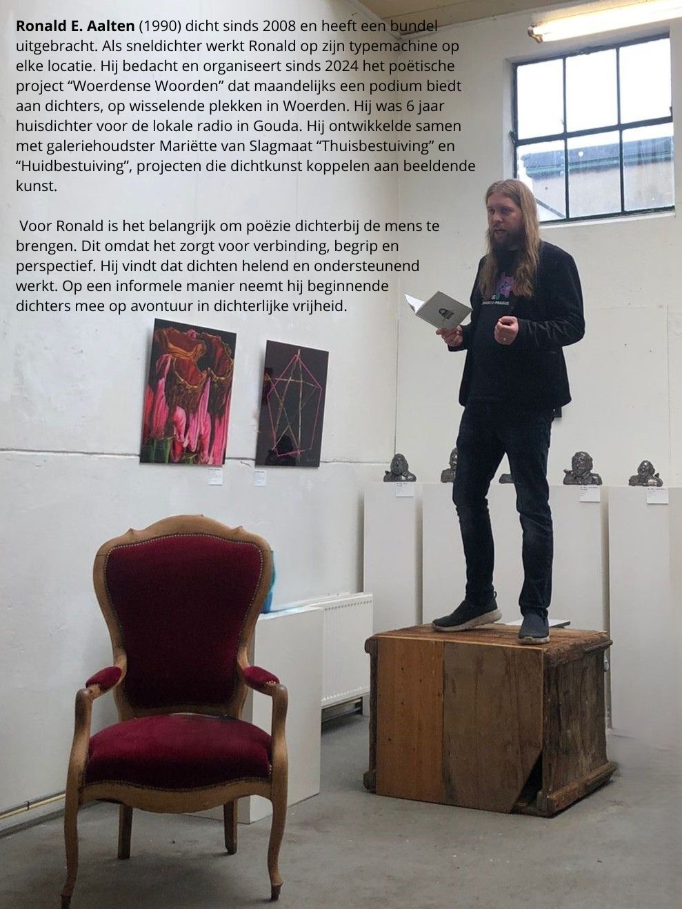 | Wo 9 juli 2025 – Galerie 20.00 uur Workshop voor beginnende dichters met dichter Ronald E. Aalten Duur ongeveer 2 uur - Maximaal 10 deelnemers - Wij zorgen voor schriften en pennen, koffie en thee Deelnamekosten € 15 per persoon Schrijf je zelf gedichten of zou je dat willen? In deze laagdrempelige workshop neemt de Woerdense dichter Ronald E. Aalten je mee in zijn wereld. Hij vertelt over zijn schrijfproces en geeft oefeningen voor jouw schrijfproces. Jullie bespreken stijltheorie. Je schrijft gedichten en draagt ze aan het einde van de avond aan elkaar voor. Als je wilt mag je eigen gedichten meebrengen om deze te fine tunen. Je gaat naar huis met eigen geschreven gedichten. Klik op de afbeelding rechts voor een biografie van Ronald. |