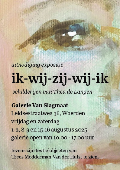| Vr 1 tm za 16 augustus 2025 – Expositieruimte Thea de Langen (1954) groeide op in Woerden en heeft een brede achtergrond in cultuur. Ze was muziekdocent, studeerde kunstgeschiedenis en werkte in cultuur en erfgoed educatie. Thea exposeert met portretten in de expositie ík-wij-zij-wij-ik’. Naast de schilderijen van Thea zijn verrassende textielobjecten te zien van Trees Modderman – van der Hulst. |