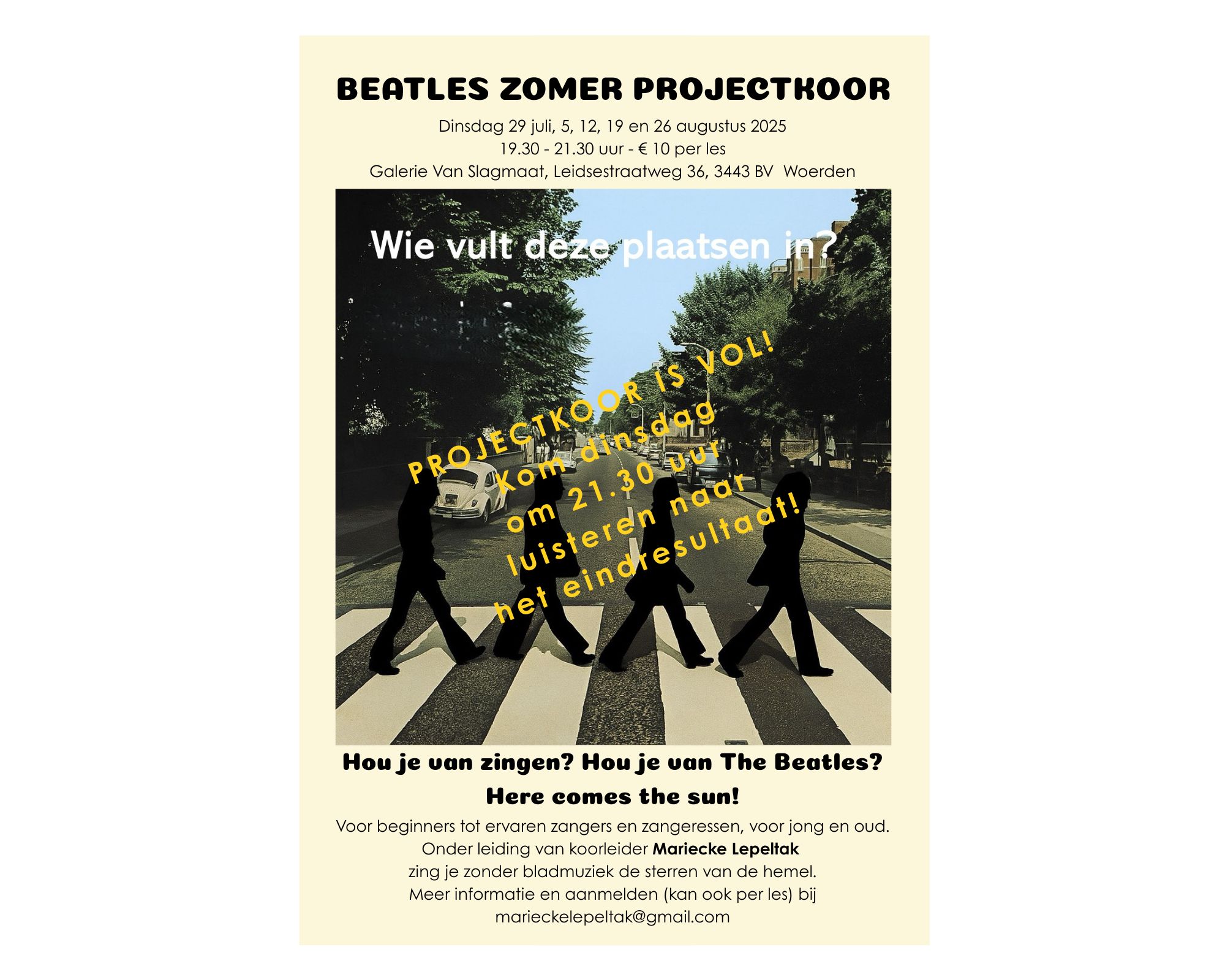 | Di 19 juli, 5, 12, 19 en 26 augustus 2025 – Galerie BEATLES ZOMER PROJECTKOOR Hou je van zingen? Hou je van The Beatles? Here comes the sun! Je hoeft je niet te vervelen deze zomer want onder leiding van koorleider Mariecke Lepeltak zing je zonder bladmuziek de sterren van de hemel. Voor beginners tot ervaren zangers en zangeressen, voor jong en oud. We zingen in de galerie op dinsdagavond 19.30-21.00 uur op 29 juli, 5, 12, 19 en 26 augustus 2025. € 10 per keer. LET OP: het koor zit vol! Je bent welkom om 21.30 uur om het eindresultaat te beluisteren! Aanmelden en meer informatie bij marieckelepeltak@gmail.com Zin in!! |