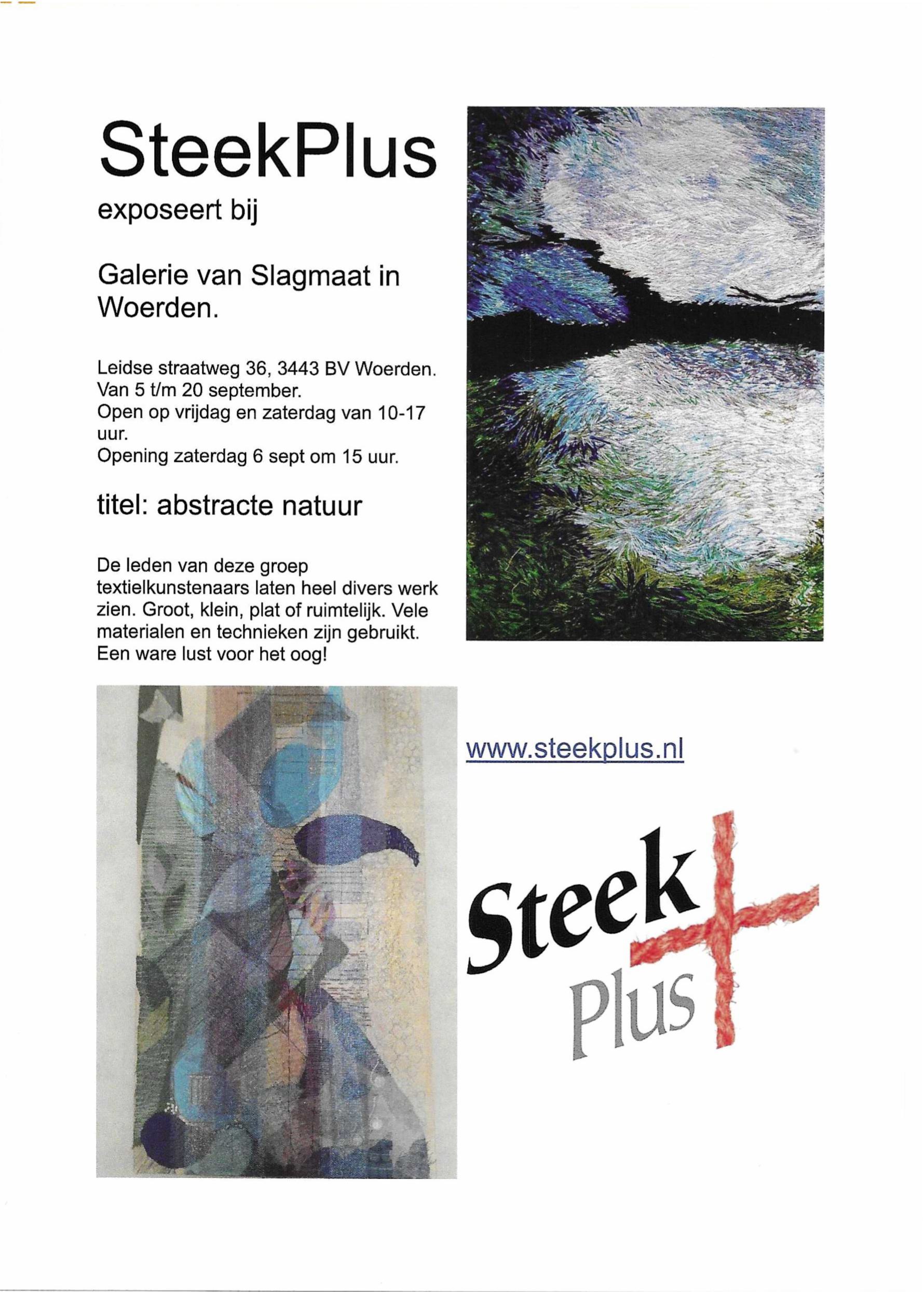 | Vr 5 tm za 20 september 2025 – Expositieruimte Textielkunstenaars van SteekPlus exposeren met heel divers werk rond het thema ‘Abstracte Natuur’. Groot, klein, plat en ruimtelijk, in veel verschillende materialen en technieken. Een lust voor het oog! SteekPlus is een landelijke groep textielkunstenaars met ongeveer zeventig leden, van professioneel tot beginnend kunstenaar. Zij maken textielkunst in allerlei vormen, vanuit verschillende achtergronden. Ze gebruiken steken op stof, maar ook verf, papier, tyvek, ijzerdraad en alles wat je verder maar bedenken kunt. Je bent welkom bij de feestelijke opening op zaterdag 6 september 2025 om 15 uur, die muzikaal wordt omlijst door de jonge Litouwse pianist Simas Urbonavicius uit Woerden. |