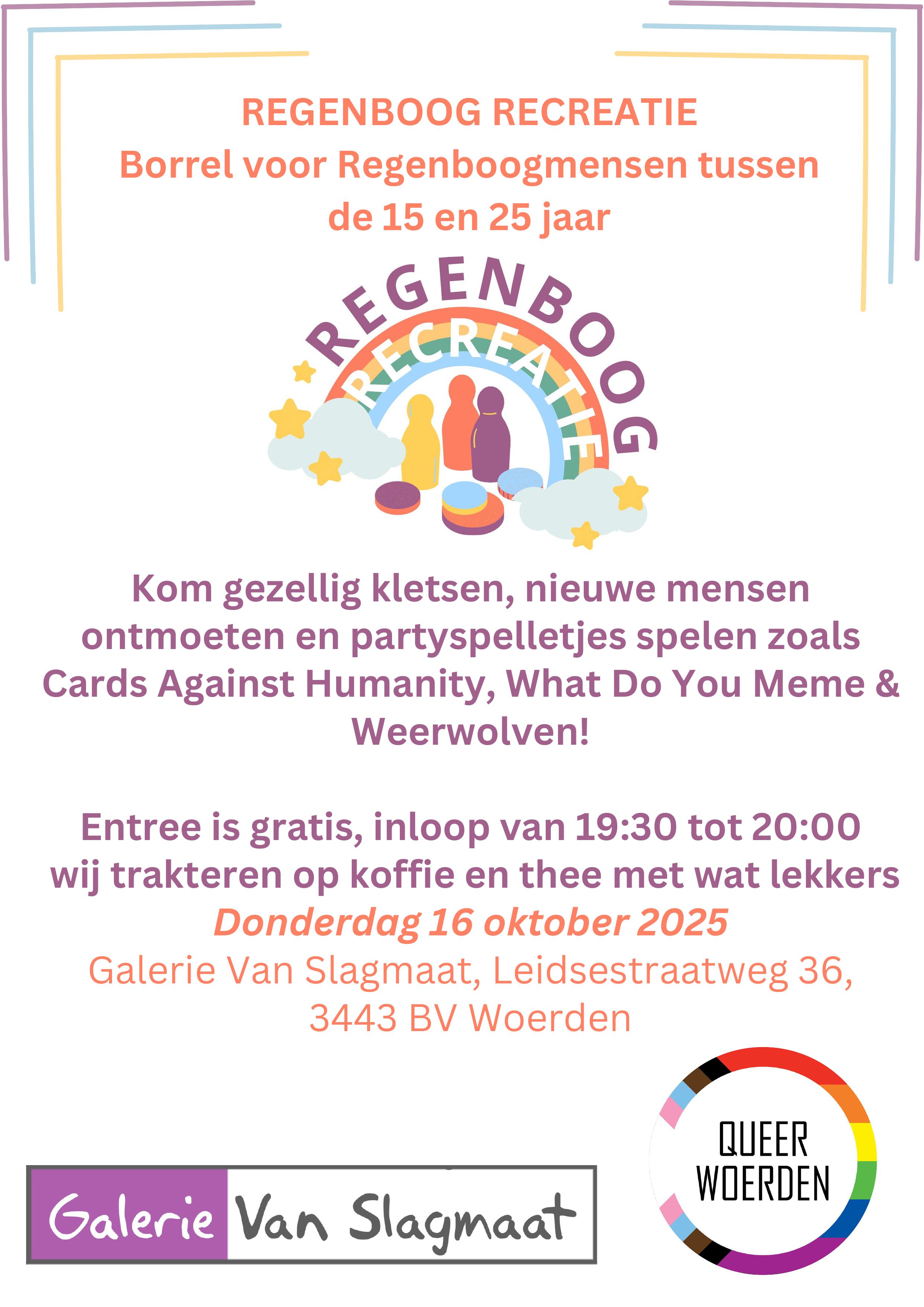 | Do 16 oktober 2025 20.00 uur – Galerie Gezelligheid in de galerie: REGENBOOG RECREATIE, een spelletjesavond - 30 Seconds, Cards against Humanity, What do you meme, Weervolven etc.- voor regenboogjongeren (en hun fans) tussen15-25 jaar. Inloop van 19.30- 20.00 uur, gratis entree en koffie en thee. |