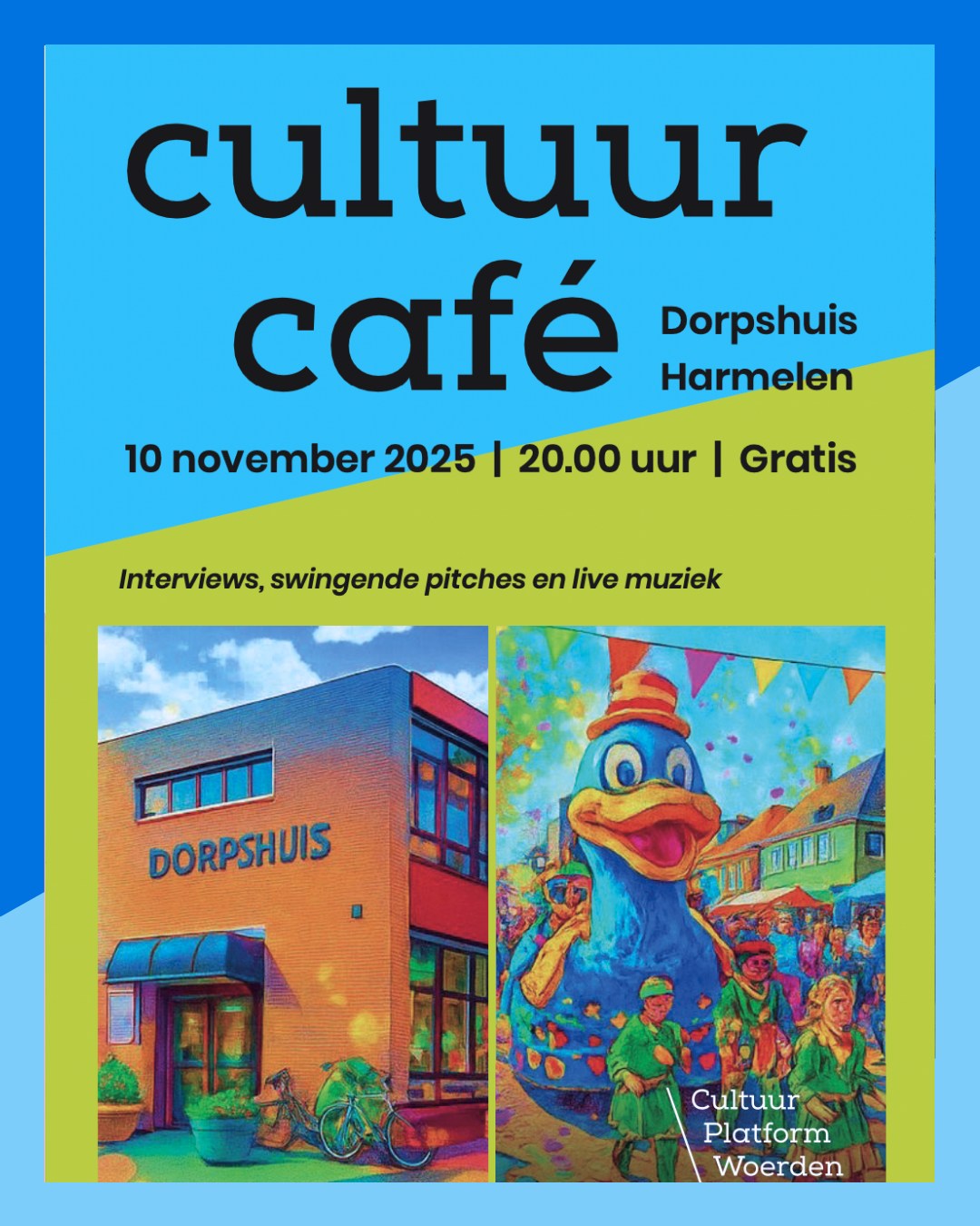 | Ma 10 november 2025 – 20.00 uur Dorpshuis Harmelen Cultuur Platform Woerden organiseert samen met Dorpshuis Harmelen een spetterend Cultuurcafé. Host Marco van Schaik wordt geassisteerd door Corinna Mitrovitch en Karla Peijs. Entree gratis. Klik HIER voor het o-zo leuke en bomvolle programma! |