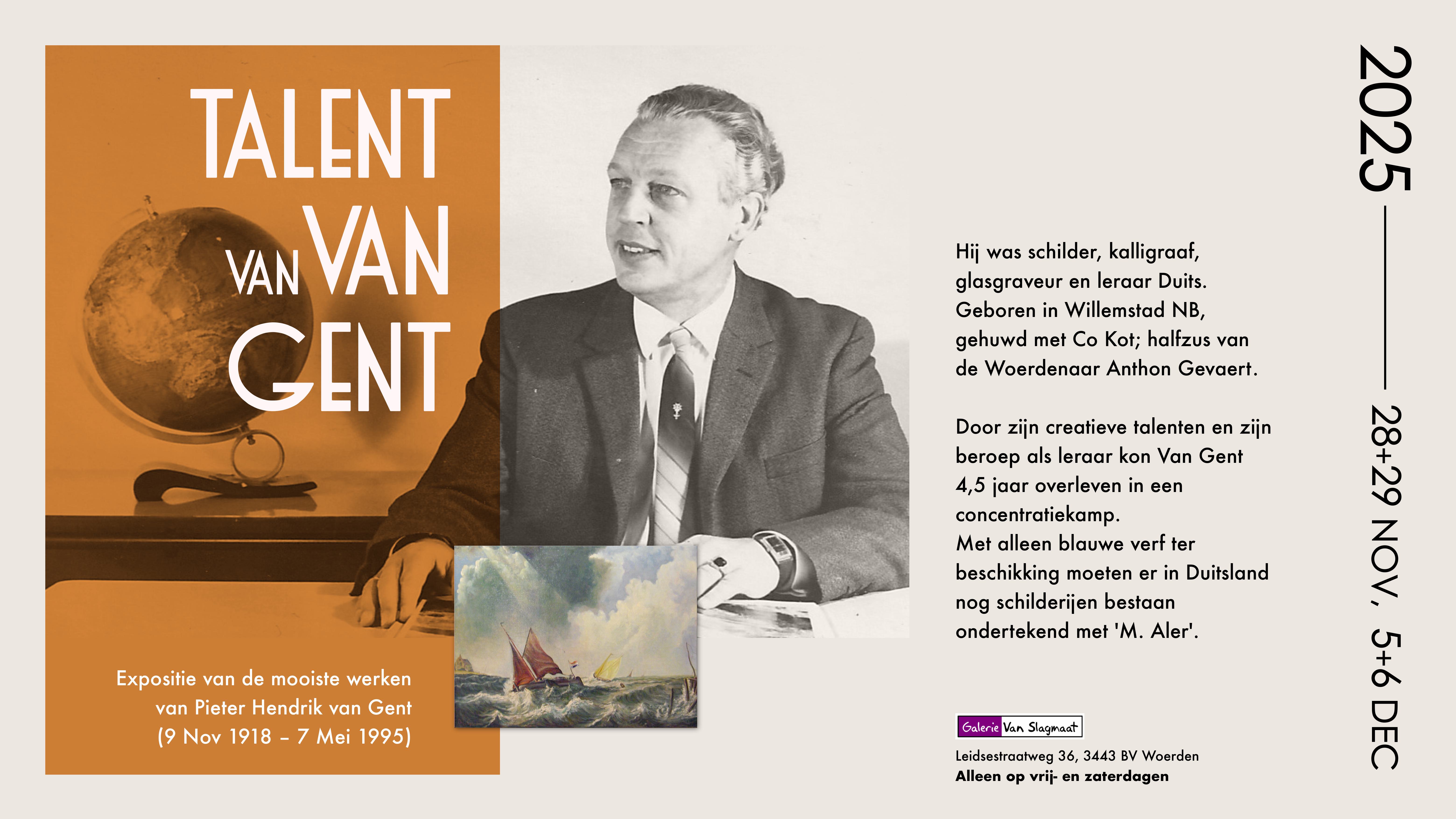 | Vr 28 november tm za 6 december 2025 – Expositieruimte TALENT VAN VAN GENT bijzondere expositie met de mooiste werken van Pieter Hendrik van Gent (9 nov 1918 – 7 mei 1995). Hij was schilder, kalligraaf, glasgraveur en leraar Duits. Geboren in Willemstad NB, gehuwd met Co Kot; halfzus van de Woerdenaar Anthon Gevaert. Door zijn creatieve talenten en zijn beroep als leraar kon Van Gent 4,5 jaar overleven in een concentratiekamp. Met alleen blauwe verf ter beschikking moeten er in Duitsland nog schilderijen bestaan ondertekend met 'M. Aler'. Kijk voor meer informatie over Pieter van Gent, zijn werk en de expositie op https://pieterhendrikvangent.nl/nl/ |