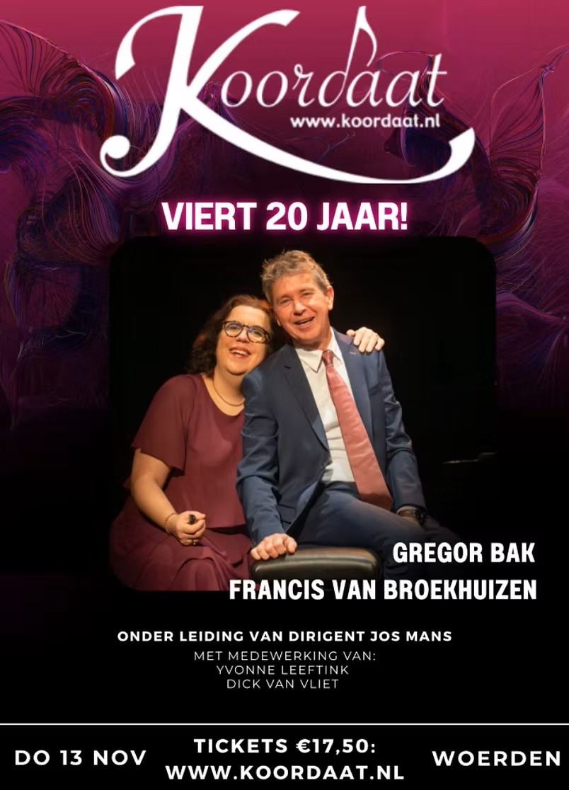 | Do 13 november 2025 -20.00 uur – Maranathakerk Woerden Dameskoor Koordaat viert onder leiding van dirigent Jos Mans haar 20-jarig jubileum met een concert – en niet zo maar ééntje: met een gastoptreden van de beroemde dramatische sopraan en comédienne Francis van Broekhuizen en de onvolprezen Gregor Bak op piano. Presentatie door uw galeriehoudster -yeehaa! Tickets à € 17,50 via hun website of bij mijn overbuur Van Vliet Muziek, Leidsestraatweg 9. (Niet te lang wachten, al bijna uitverkocht!) |