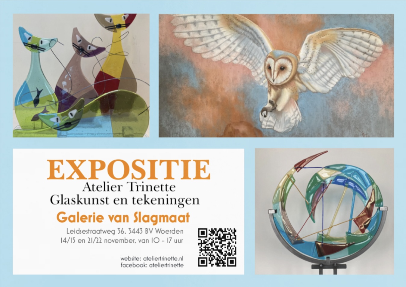 | Vr 14 tm za 22 november 2025 – Expositieruimte Trinette van Atelier Trinette exposeert met glasobjecten en tekeningen. Voor de glasobjecten gebruikt zij de techniek “glasfusing”. Dit is een techniek waarbij stukken gekleurd glas geheel of gedeeltelijk worden versmolten. Vooral met zonlicht erop zijn de objecten door hun kleuren erg mooi en sprekend. Haar tekeningen maakt zij in houtskool (zwart-wit) of softpastel (kleur). Daarbij gaat haar voorkeur uit naar portretten van zowel mens als dier. |