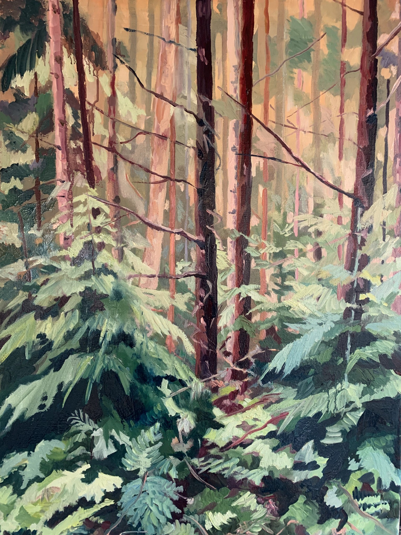 Bos in roze licht - Iris Duchateau, olieverf op doek, 84 x 63 cm