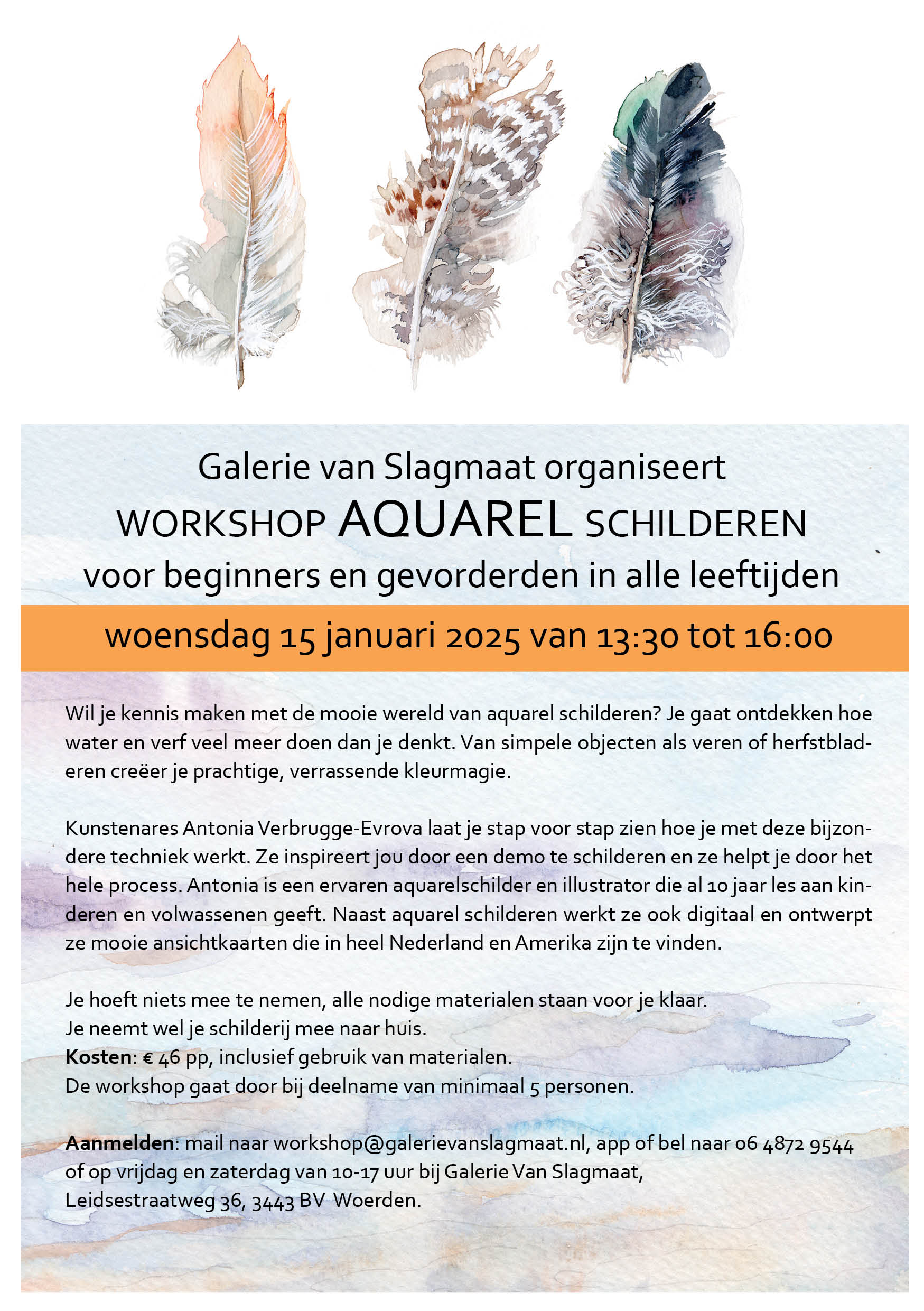 Op woensdag 15 januari 2025 geeft de Woerdense kunstenares Antonia Verbrugge-Evrova een hele leuke workshop Aquarel schilderen in de galerie! Klik op de flyer voor meer informatie.